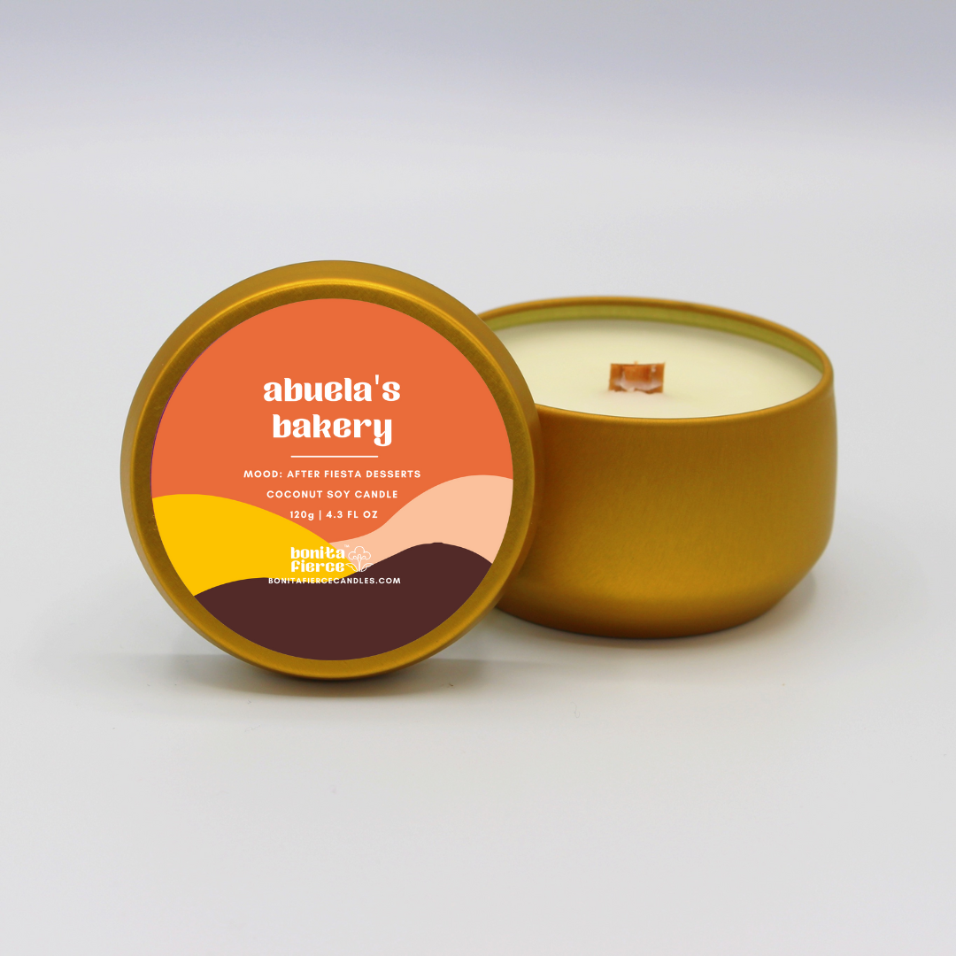 4.3 oz reusable gold tin with a 25-30 hour burn time. 8.5 oz in a 13 oz reusable glass vessel with a 50-60 hour burn time. Our coconut soy wax candles are gluten-free, paraben-free, phthalate free with an FSC-certified wooden wick and a plantable seed paper dust cover (excluding tin). We hand-pour in micro-batches in New York, Latina owned.