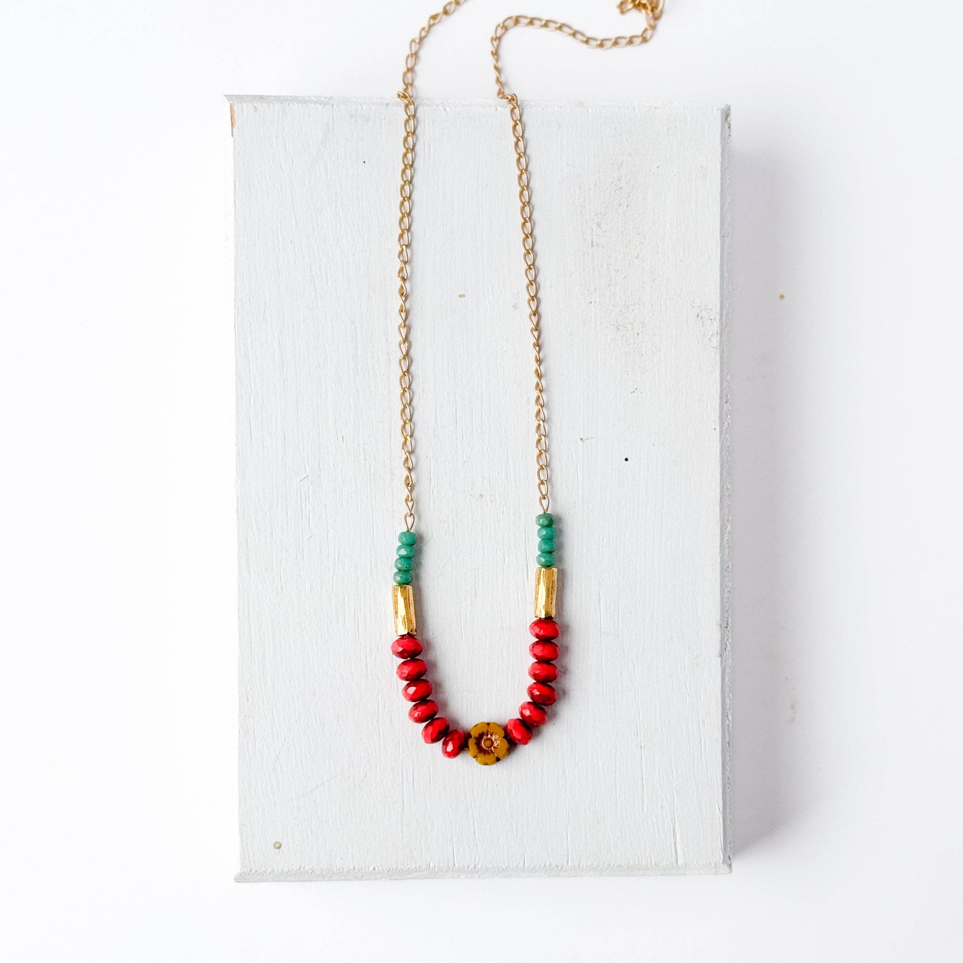 An adjustable necklace with a 2-inch extension for versatility. It features bright red glass beads, a small 5mm mustard-colored glass flower, antique gold-plated beads, and tiny turquoise accent beads. The chain is 24K matte gold-plated with a brushed satin finish. Handmade in Vermont.
