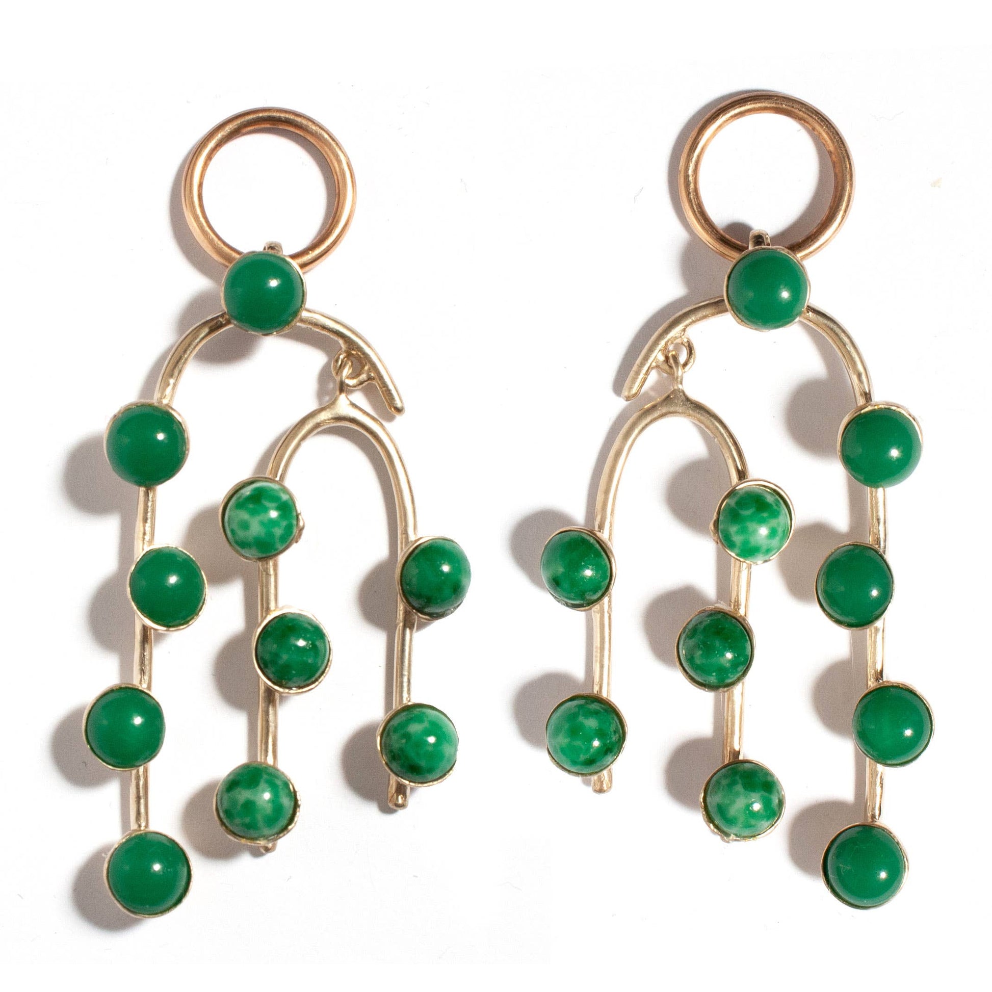 Delicate vintage glass cabochons in luminous tones dangle gracefully from handcrafted brass arcs, creating an earring that moves fluidly with you. The sculptural design frames your face with an airy elegance while catching light in soft, mesmerizing waves. Refined yet contemporary, these pieces balance serene sophistication with modern sensibility. Crafted from 100% recycled brass, vintage glass stones, and sterling silver posts. Handmade in NYC.