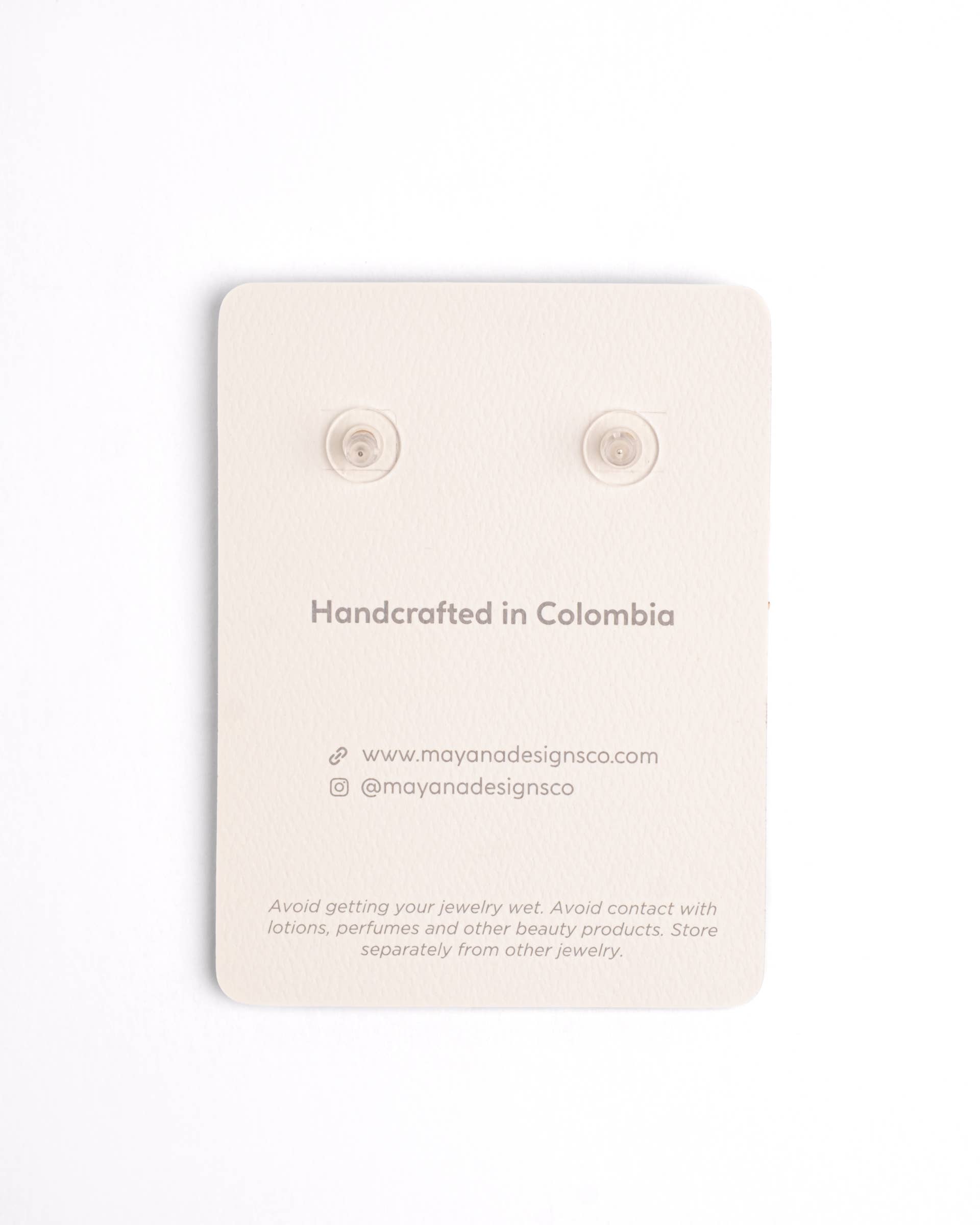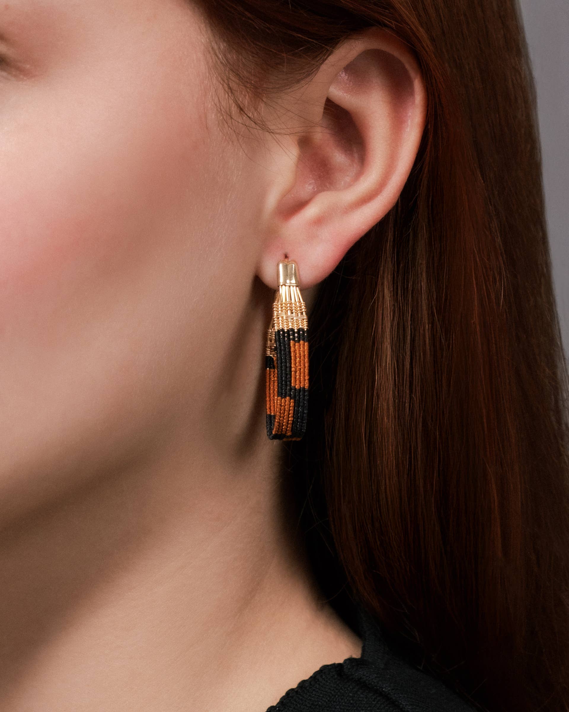 These stunning earrings combine twisted high quality gold-plated wires, which are polymer coated for longevity and durability, with beautiful tones of meticulously woven and wrapped colorful cord. Featuring color blocking at its best, these earrings, although modestly sized and lightweight, make an elegant statement. These earrings are handwoven by women living in vulnerable communities in Colombia which is detailed on the back of our earring cards. Materials Polymer Coated Gold Plated Wire Nylon Cord Size Length 1.5 Inches Width .25 Inch Weight .20 oz.