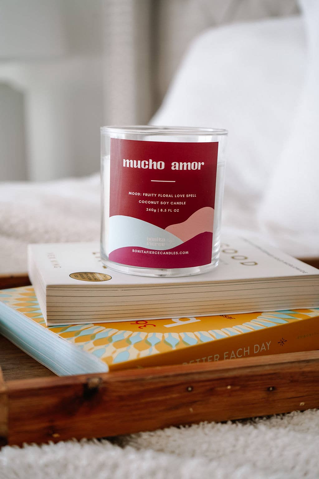 Mood: Fruity Floral Love Spell Notes: Apple, Peach, Grapefruit, Cherry Blossom, Hydrangea, Vanilla, Powder. 3.5 oz reusable gold tin with a 20-25 hour burn time. Our coconut soy wax candles are gluten-free, paraben-free, phthalate free with a dust cover. We hand-pour in micro-batches in New York, Latina & Hispanic owned.