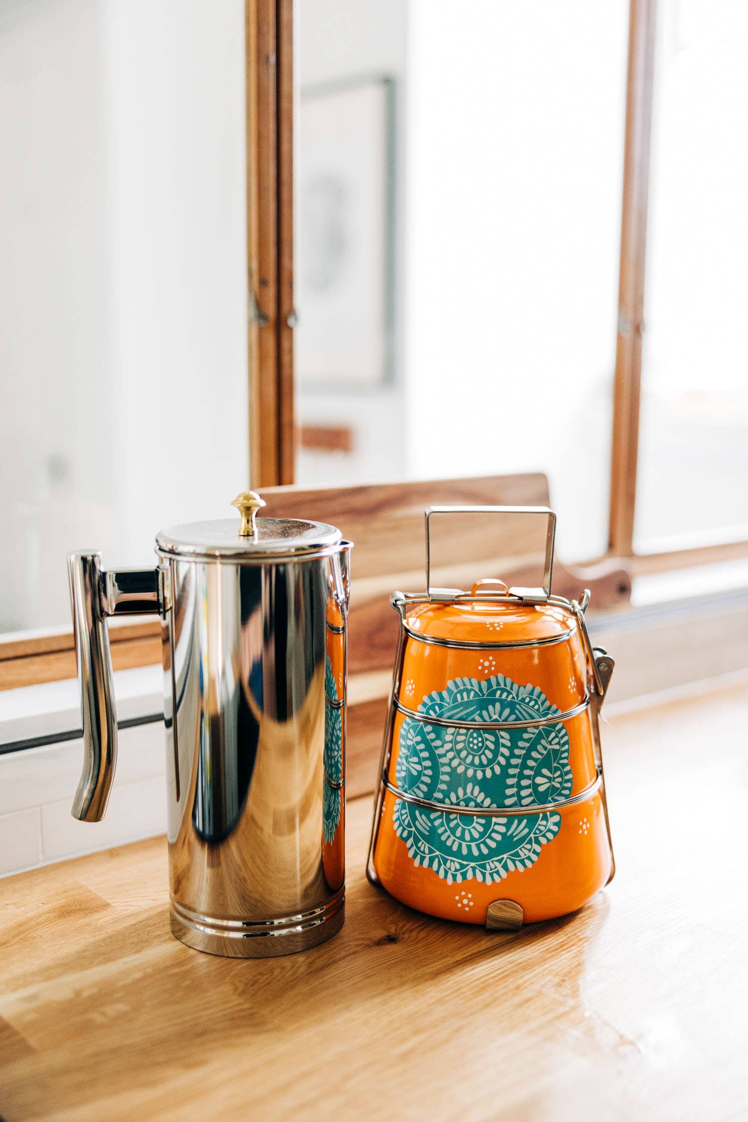 Going plastic-free at lunchtime is as easy as 1-2-3 with this 3 Tier Steel Tiffin To Go Container. Featuring 3 different stainless steel containers with lids that stack and connect, your lunch will stay put and you'll never buy another single-use plastic baggie again. This handcrafted container system is powder coated in orange with a hand-painted blue and white design so your lunch is as stylish as it is eco-friendly. Bonus: the larger two lids can act as plates when meal time arrives. Material: stainless steel. Product Care: hand wash only. Dimensions: top compartment - 4.5"D x 3"H. Center compartment - 4.75" x 2.5"H. Bottom compartment - 5.5"D x 2.5"H. Includes stainless steel handle and clamp system that attach the 3 containers together, creating a mobile unit. Handcrafted in India.