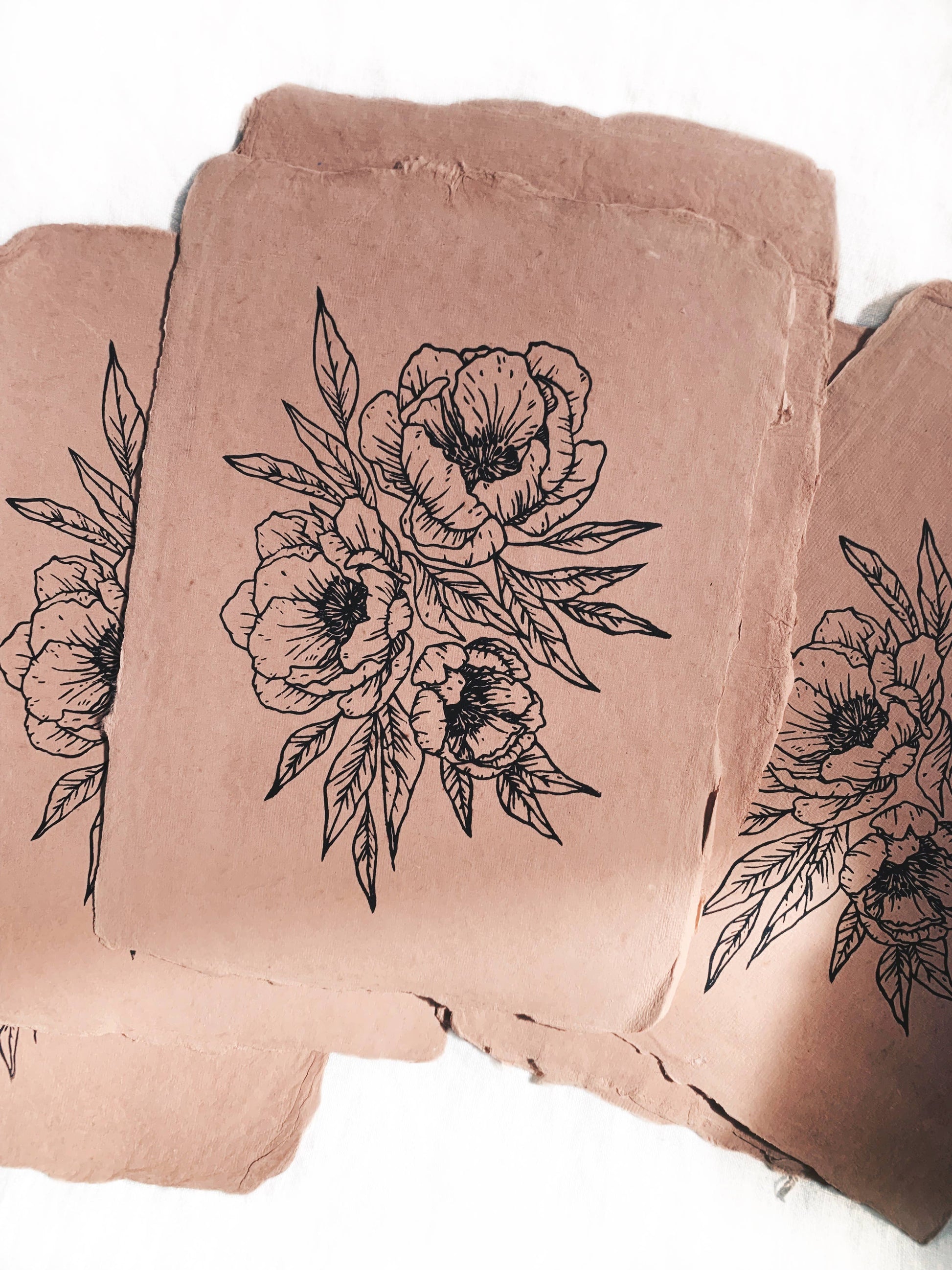 This lush bouquet began as a sketch, which was transferred onto a rubber block, hand carved, and then inked and printed by hand. The color palette was carefully curated to enhance this composition. A black archival ink that pops on a rose/mauve colored handmade paper with beautifully deckled edges. This print gives off vintage vibes with the dusty rose paper and the delicate line drawing of peonies. Due to the handprinted nature, each piece is an original. Slight variations may occur, adding to the charm of hand stamped pieces. The artwork comes unframed and safely packaged in a sleeve with supportive backing. Size: 5x7".