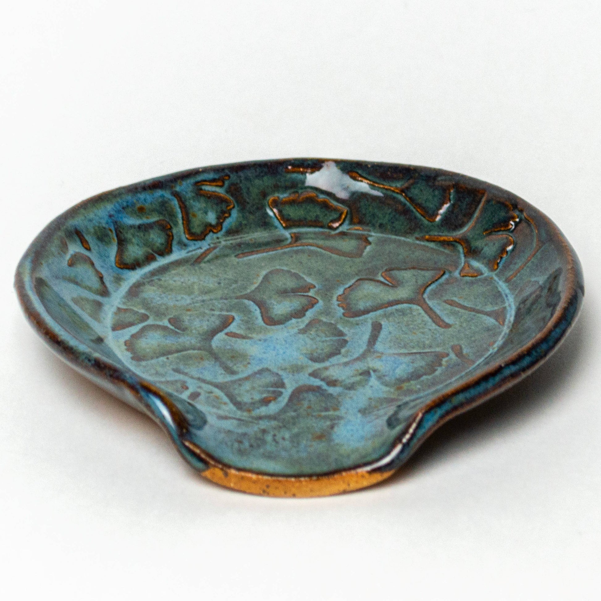 This beautiful stoneware spoon rest is decorated with a ginkgo leaf pattern and finished in a calming blue glaze.