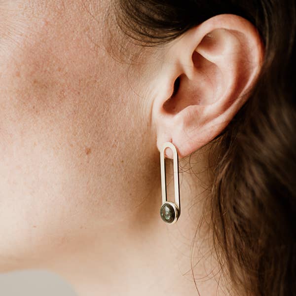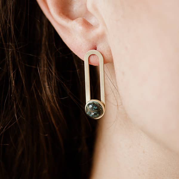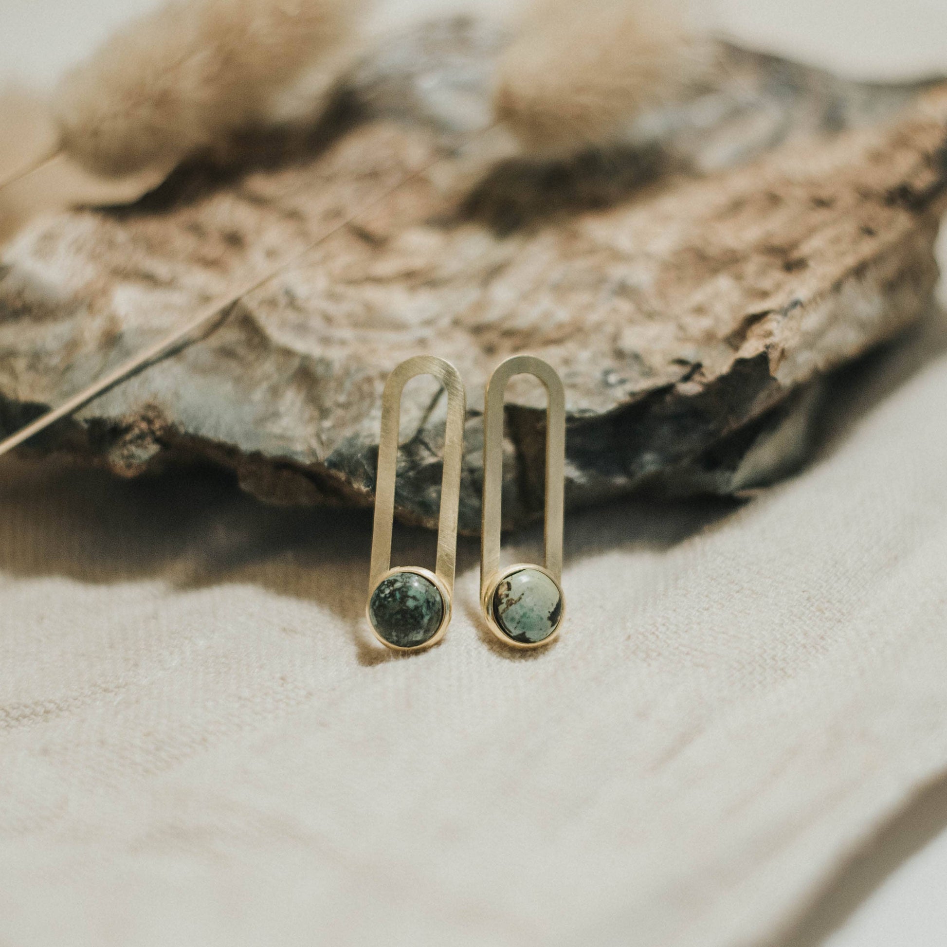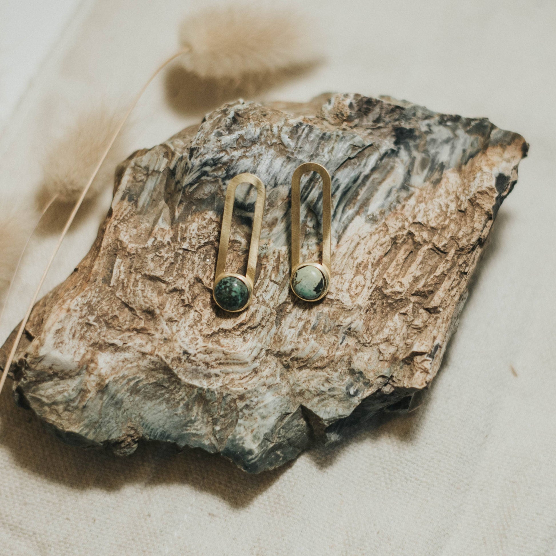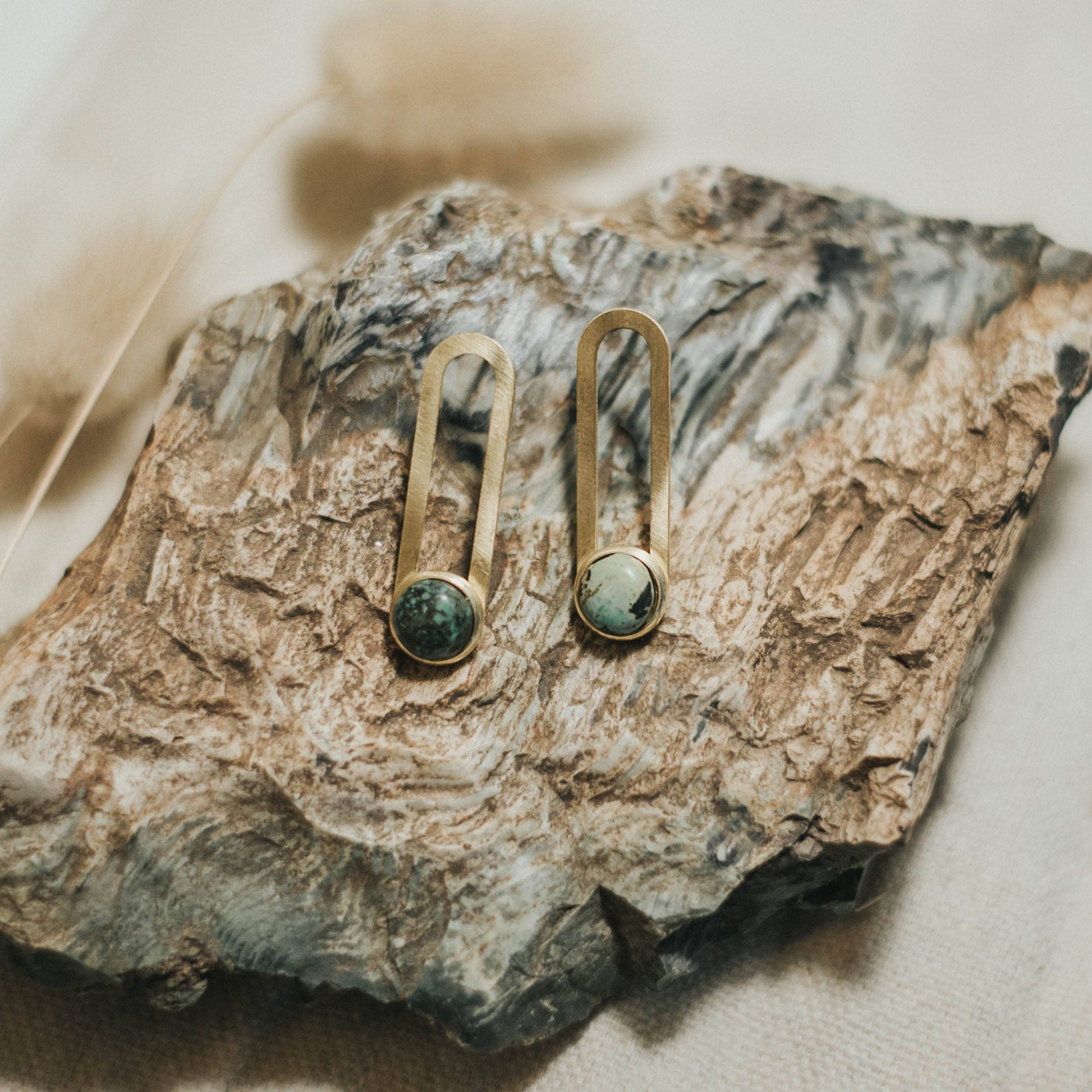 Solid brass shape on sterling silver studs with genuine turquoise stones.