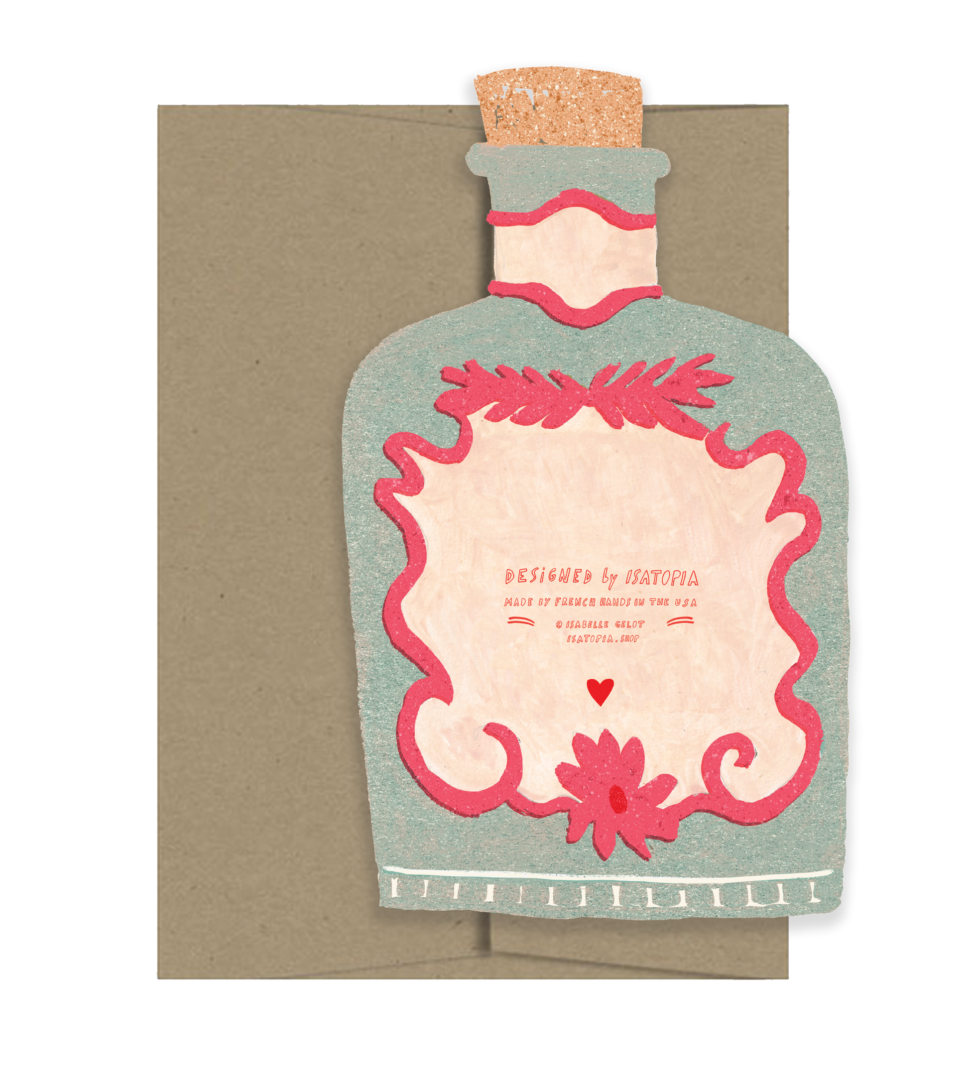 Enchanting and endearing, the Love Potion card is sure to capture the heart of your special someone. A6 - 6.25"x4.5" die cut folded card, printed in the USA on sustainably produced 18pt coated card stock. Each folded card is blank inside, comes with a brown kraft recycled envelope and is wrapped in a sustainable cello bag. Original illustrations by Isabelle. Made by French hands in the USA!