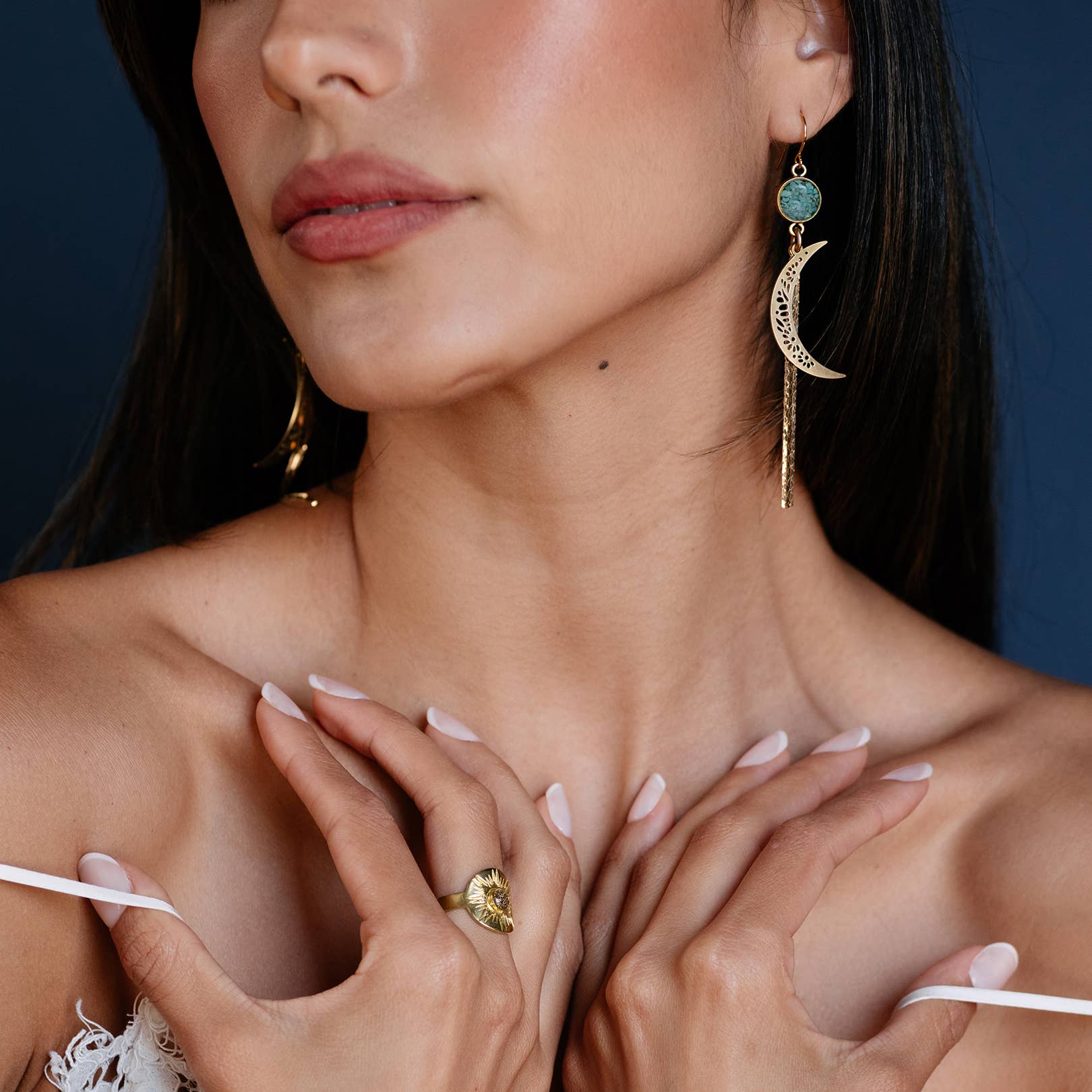 Moon Dreamer Earrings with crushed gems and tassels hangs on gold plated ear wire and comes with rubber stoppers. Brass moons and gold plated snake chain tassels. This set is green turquoise and gold leaf. First pic shows turquoise + gold leaf. Model is wearing the post earring version in green turquoise. Posts are gold plated with steel earring posts with steel butterfly clutch backings.