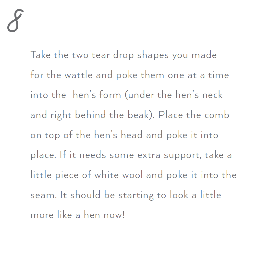 This Fran the Hen needle felting kit is perfect for beginners and includes all of the materials needed to make the project, as well as thorough instructions. This kit includes... Two 38 Gauge felting needles, 1 Foam work block, White wool, a bit of black wool, orange wool, red wool. Booklet with very detailed instructions alongside beautiful illustrations. A diagram in the back of the booklet to use as a guide for size and shape. The finished hen will be approximately 4 inches tall. WARNING... Due to small parts and very sharp needles, neither this kit, nor the finished product is intended for use by small children. The recommended age for this kit is 10 and up. Needle felting is a process in which barbed needles are used to sculpt wool fiber into various forms. There is absolutely no sewing and no use of wires or armatures of any kind in this kit. The completed hen will be made of solid wool.