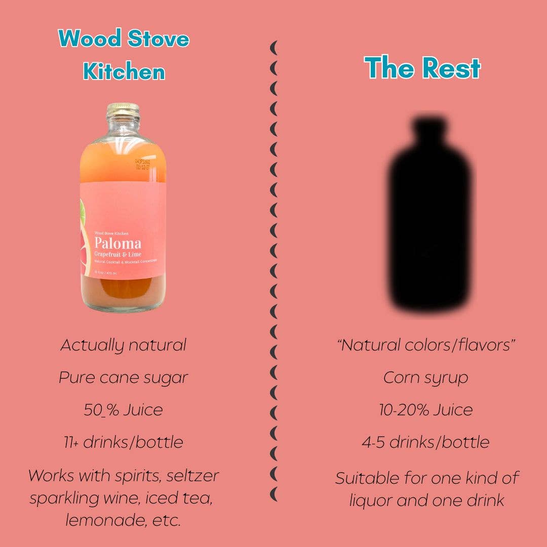 Bright, tart grapefruit combines with fresh lime to make an incredible mixer with a bright pink color that just pops on the shelves. This mixer makes it quick and easy to make one of the most popular summer-time cocktails, the Paloma. Just add 1.5-2 ounces of this natural mixer to tequila or mezcal and seltzer. It's as easy as that. The bold flavors shine through whether you're making a cocktail or a non-alcoholic mocktail. Each 16 fl oz glass bottle of this highly concentrated mixer will make up to 11 drinks.