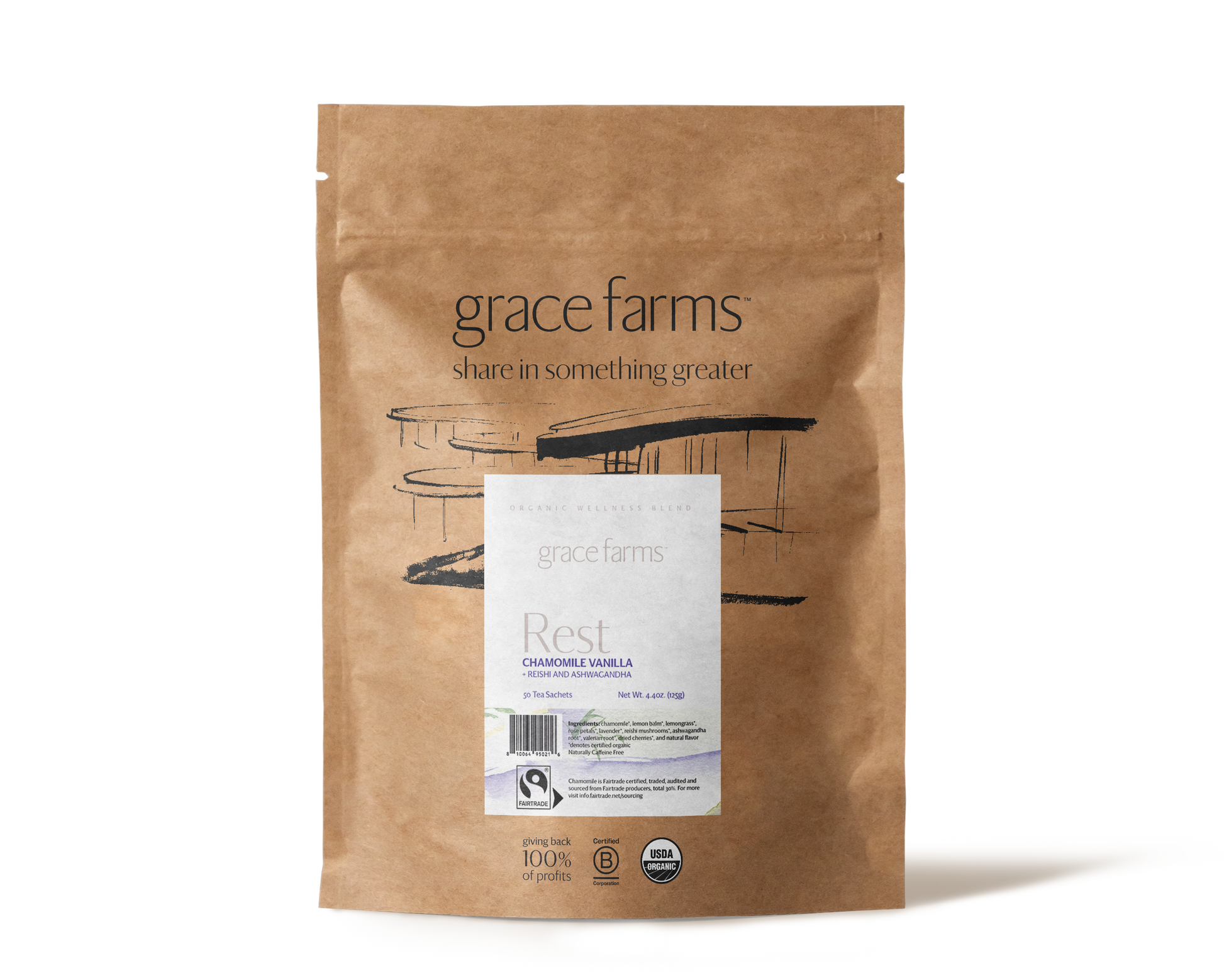 Chamomile vanilla + reishi and ashwagandha. A delicate bouquet of adaptogenic herbs, flowers, ashwagandha root, and reishi mushrooms, this tea lulls you into a restful slumber. Let your palate dream up a field of Egyptian chamomile flowers, lavender, and dried cherries enveloped in the subtle sweetness of soothing vanilla. Caffeine Free. Targeted Benefits: Reduce stress and support healthy sleep. Tasting Notes: Floral, soft, and vanilla .Ingredients: Organic chamomile, organic lemon balm, organic lemongrass, organic rose petals, organic lavender, organic ashwagandha root, organic valerian root, organic reishi mushrooms, organic dried cherries, natural vanilla flavor.