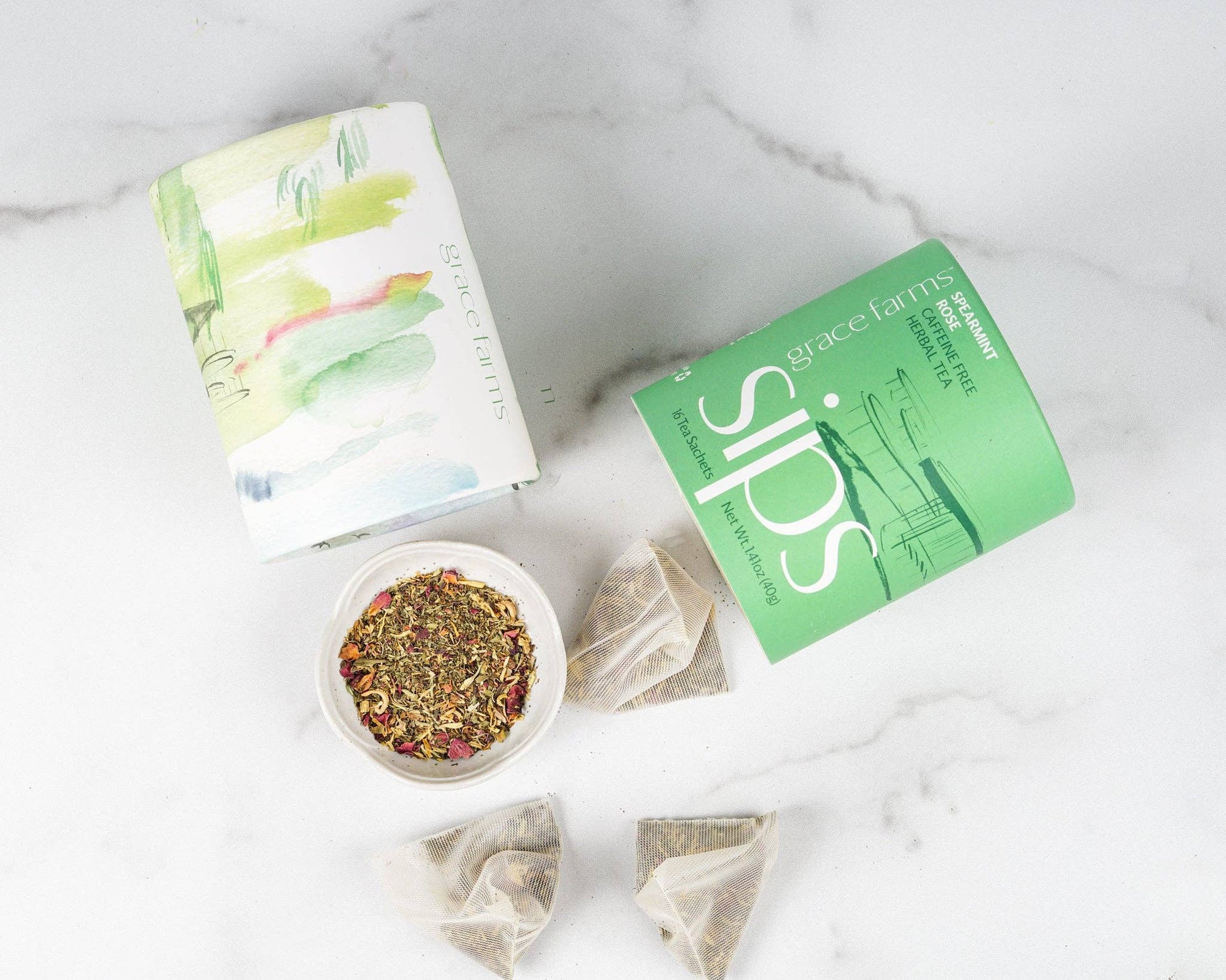 A rejuvenating blend of bold spearmint and delicate rose petals, this beautiful tea demonstrates the beauty of balance and intention. This tea will become your daily reward for all of life's little achievements. Refreshing spearmint and licorice root makes for a uniquely pleasant drink great for digestion too. Blended with organic whole leaf stevia for perfectly sweetened and healthy treat you deserve. Gives back 100% of profits to end forced labor worldwide. Each beautiful canister includes 16 x 2.5 g pyramid sachets that are 100% plastic-free and biodegradable. The refillable canister is 100% plastic-free and reveals a stunning watercolor when opened. Ingredients: organic spearmint, organic rose petals, organic licorice root, organic whole leaf stevia