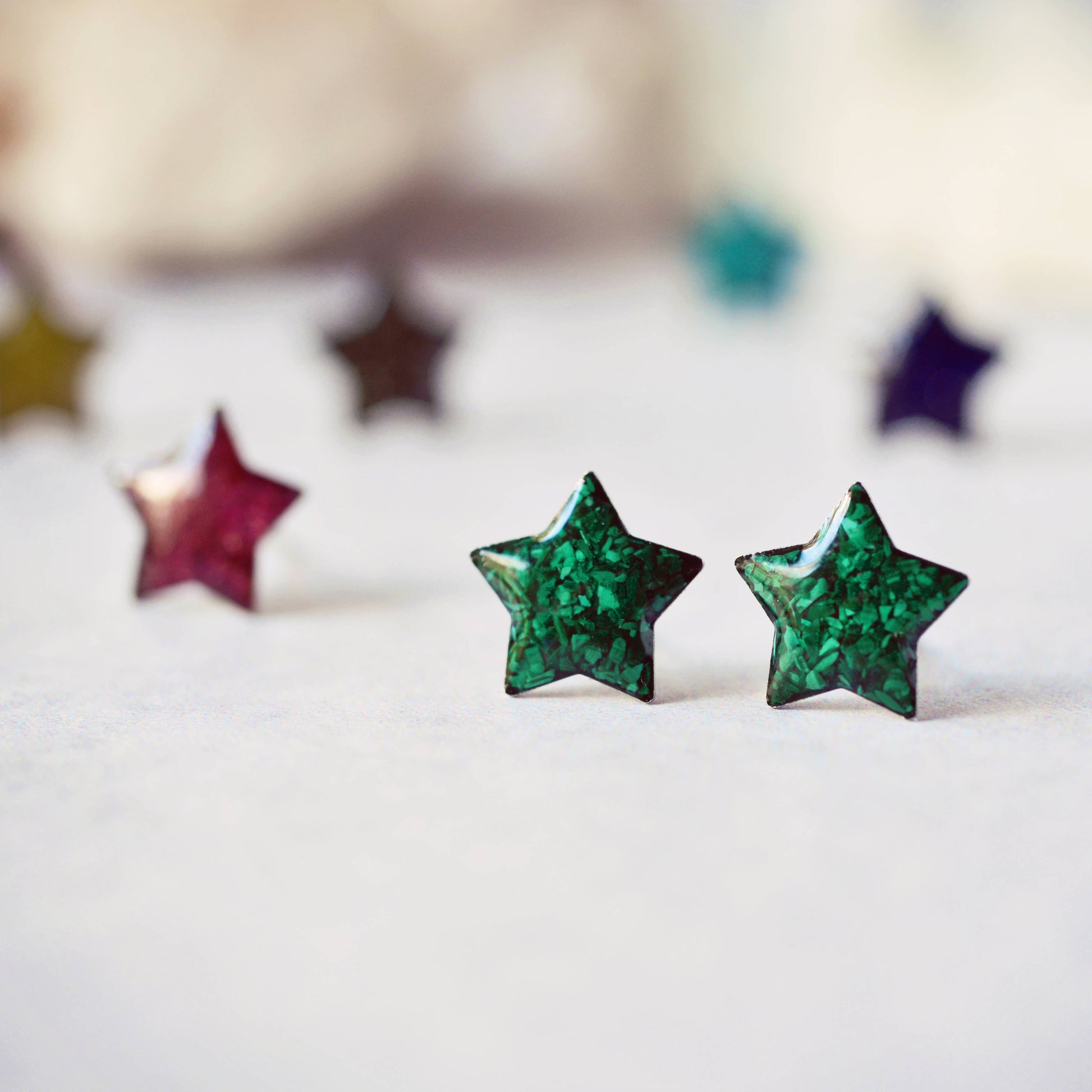 Star pack earrings with crushed gemstone stars and gold leaf. Glossy resin coating.