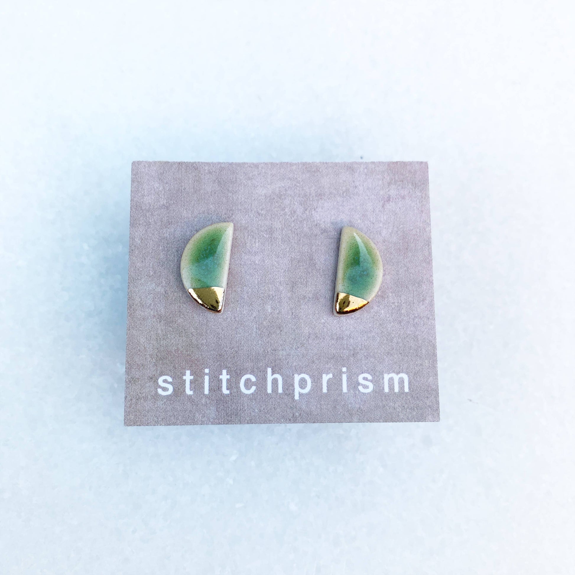 Petite half-moon studs handcrafted in white clay, each one kissed with a vibrant green glaze and gilded gold accent along the base. Featuring hypoallergenic surgical steel posts and completely nickel-free for sensitive ears. Approximately 10mm, these little gems celebrate imperfection—no two are exactly alike, so your pair will have its own unique personality. Fair warning: the glaze shifts beautifully across the green spectrum, from grassy to turquoise, making each set one-of-a-kind.
