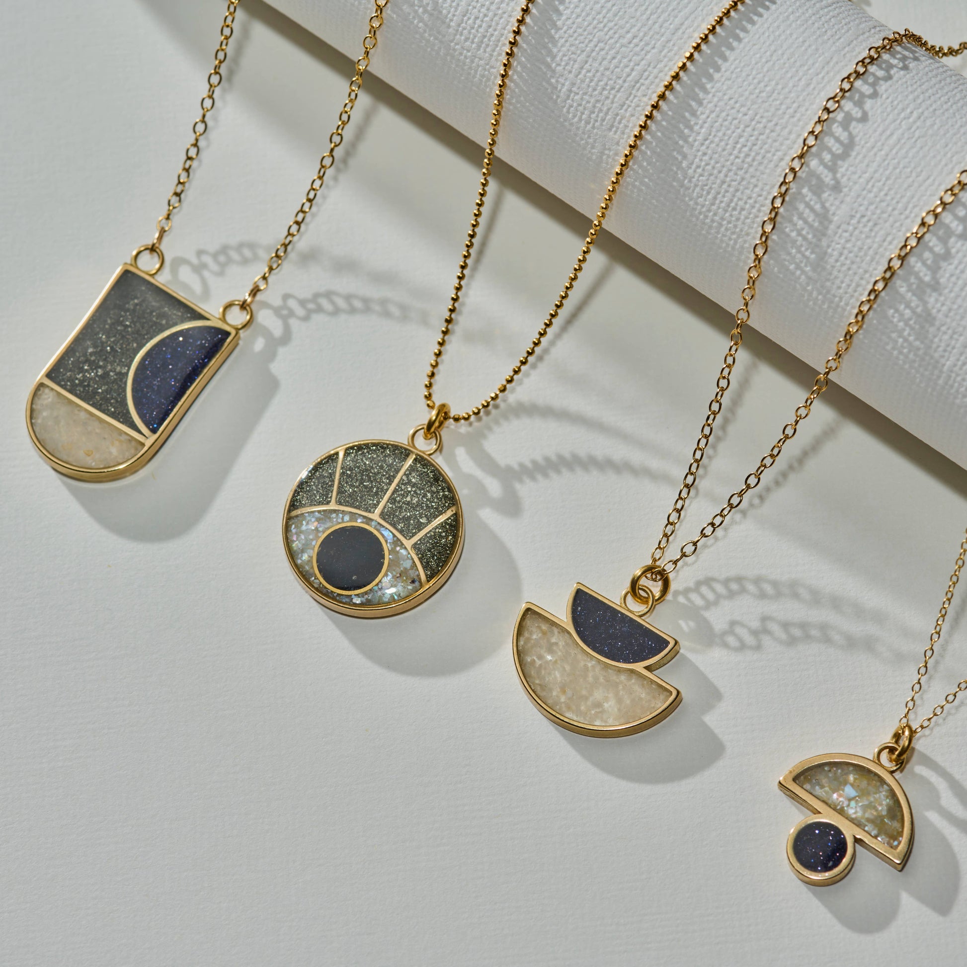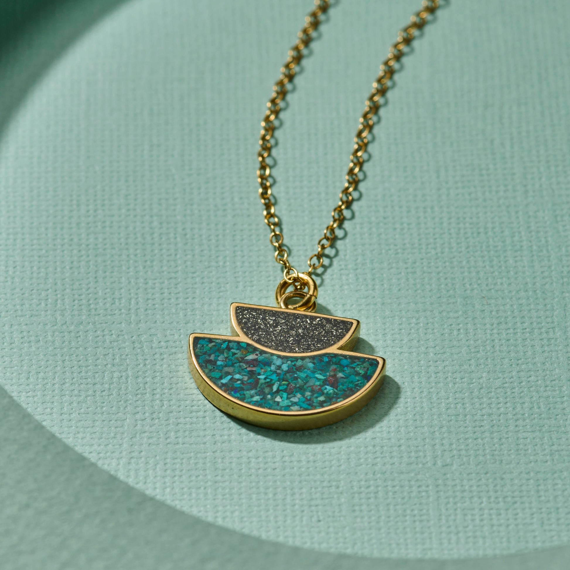 The New Moon Duo Pendant Necklace made of mother of pearl and pyrite crushed gemstones. Hangs on an 18" gold vermeil chain.