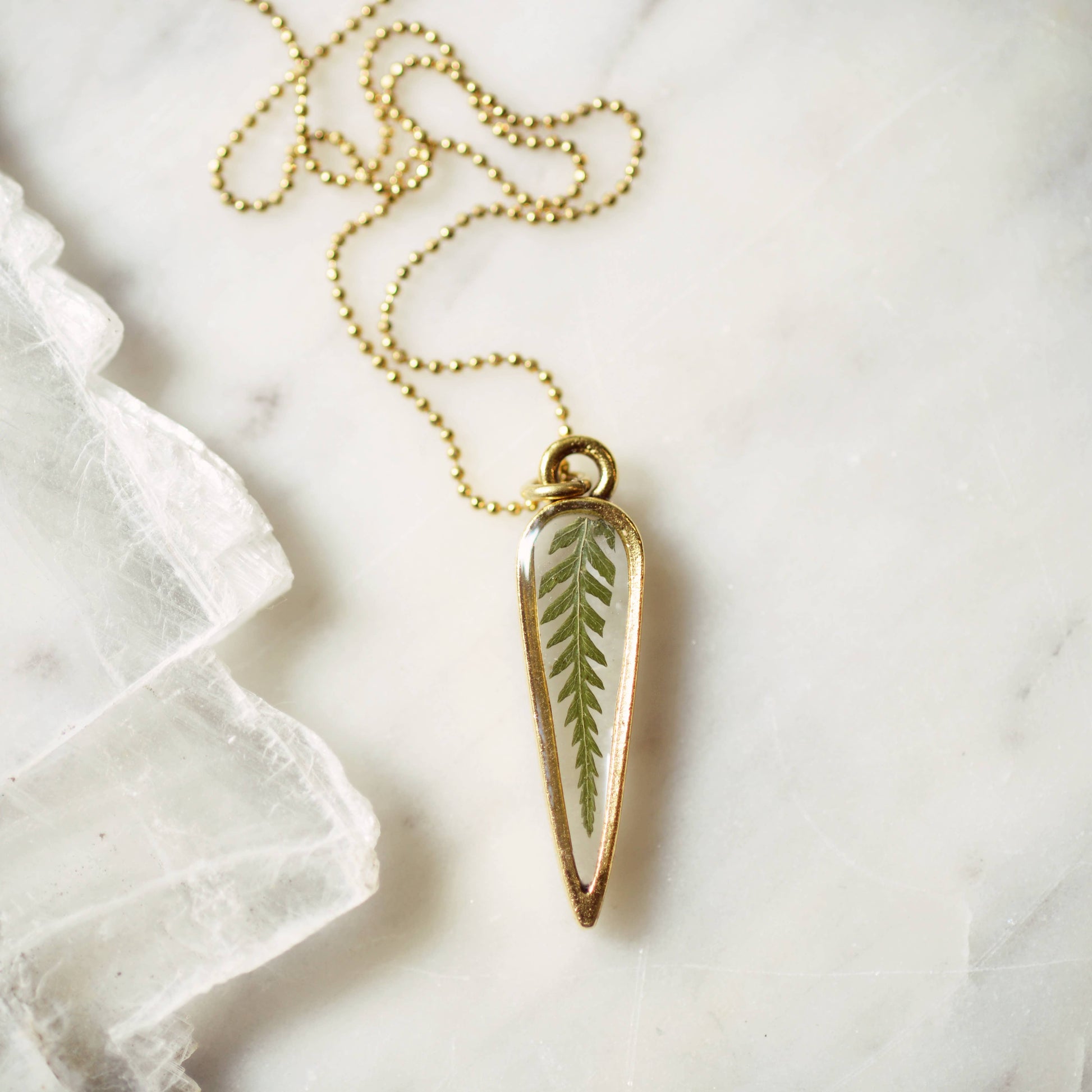 A real, beautiful pressed fern preserved in resin and set inside a 24kt gold-plated arrow setting. 30" gold plated bead chain.