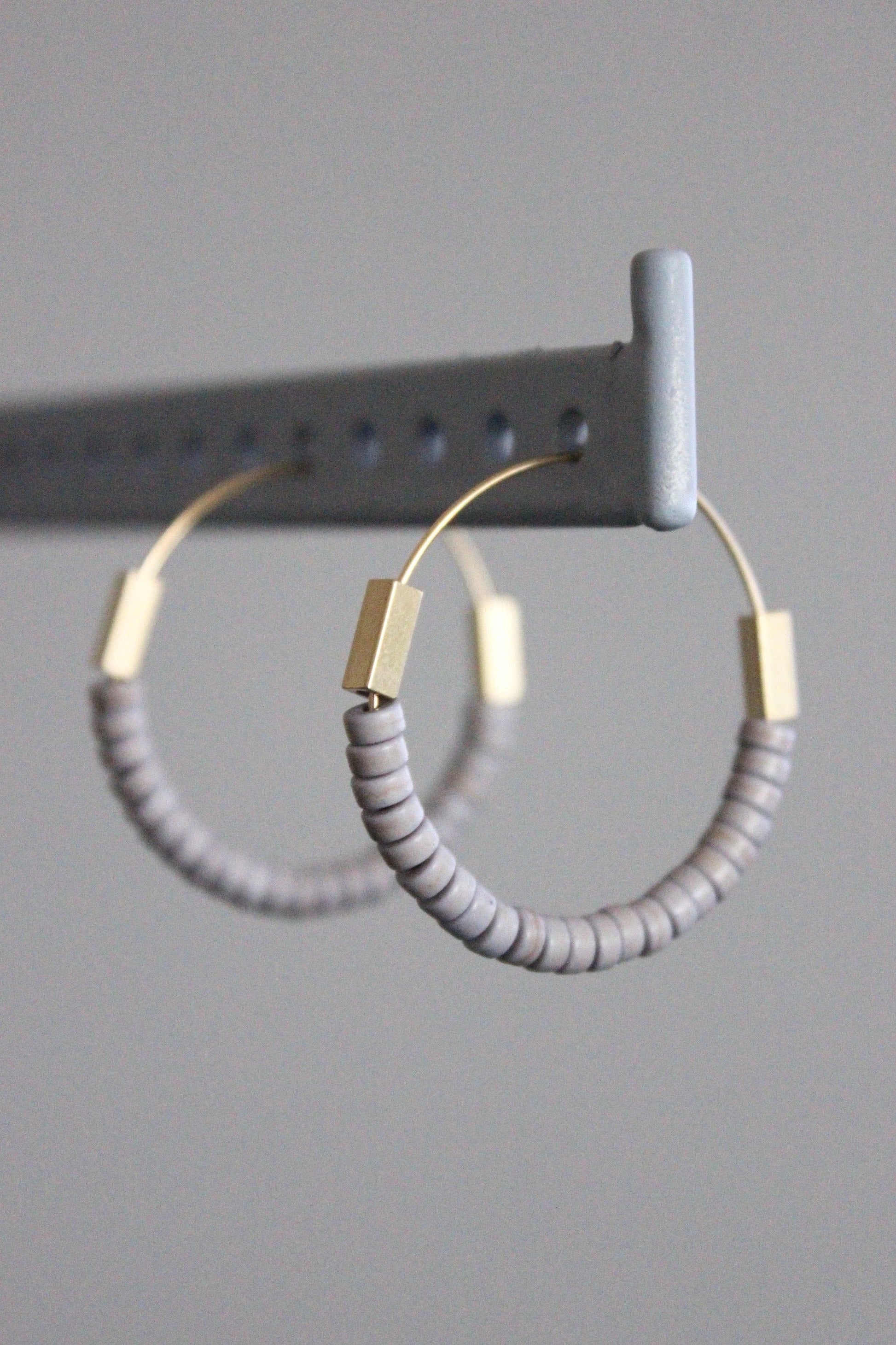 18k gold plated brass hoop with magnesite and brass. All pieces are made to order and handcrafted at our studio in New Jersey by skilled artisans who share our passion for quality and originality. Each piece is unique so stones and glass may vary in shape, size, and color. Stone inclusions may be visible to the eye and are considered a part of their beauty. Our jewelry consists of plated metal, which may darken or tarnish over time with normal wear. Gently wipe the metal surface with a soft cloth to clean, however, excessive polishing may rub off or scratch the plating. Avoid direct contact with lotions, perfumes, or oils. Excessive light, heat, or moisture will deteriorate the quality of glass, plating, and stones. Do not wear jewelry while in a pool, hot tub, or bathing. If treated with care, your jewelry will last for years to come.