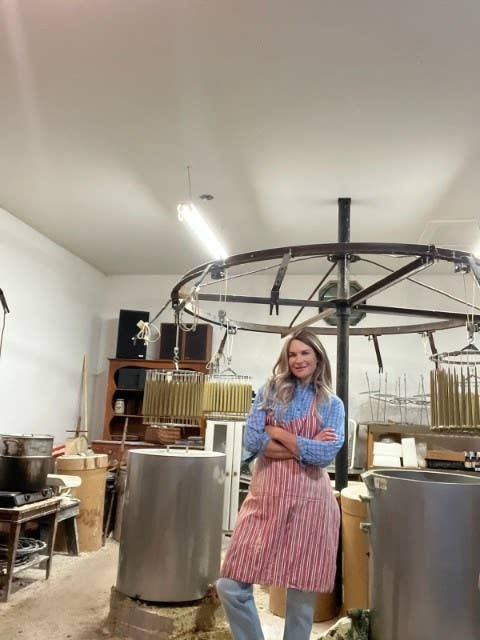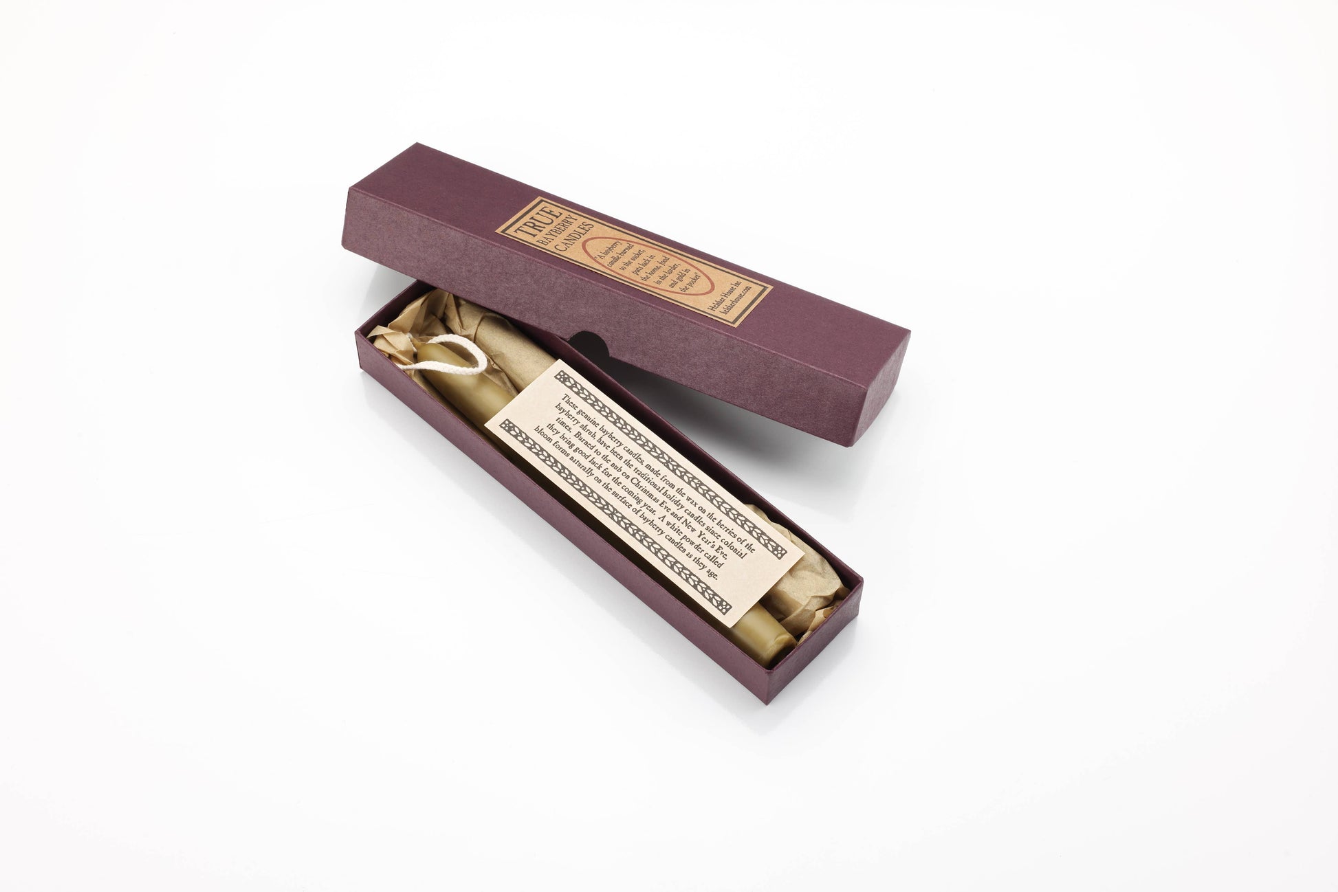 1 pair 8" real bayberry taper candles that are hand dipped on a circa 1850 candle carousel. These are the traditional candles to be burned on Christmas Eve and New Year's Eve. We have been making these candles for historic museums for 50 years. The beautiful presentation in the gift box makes this a wonderful hostess present.