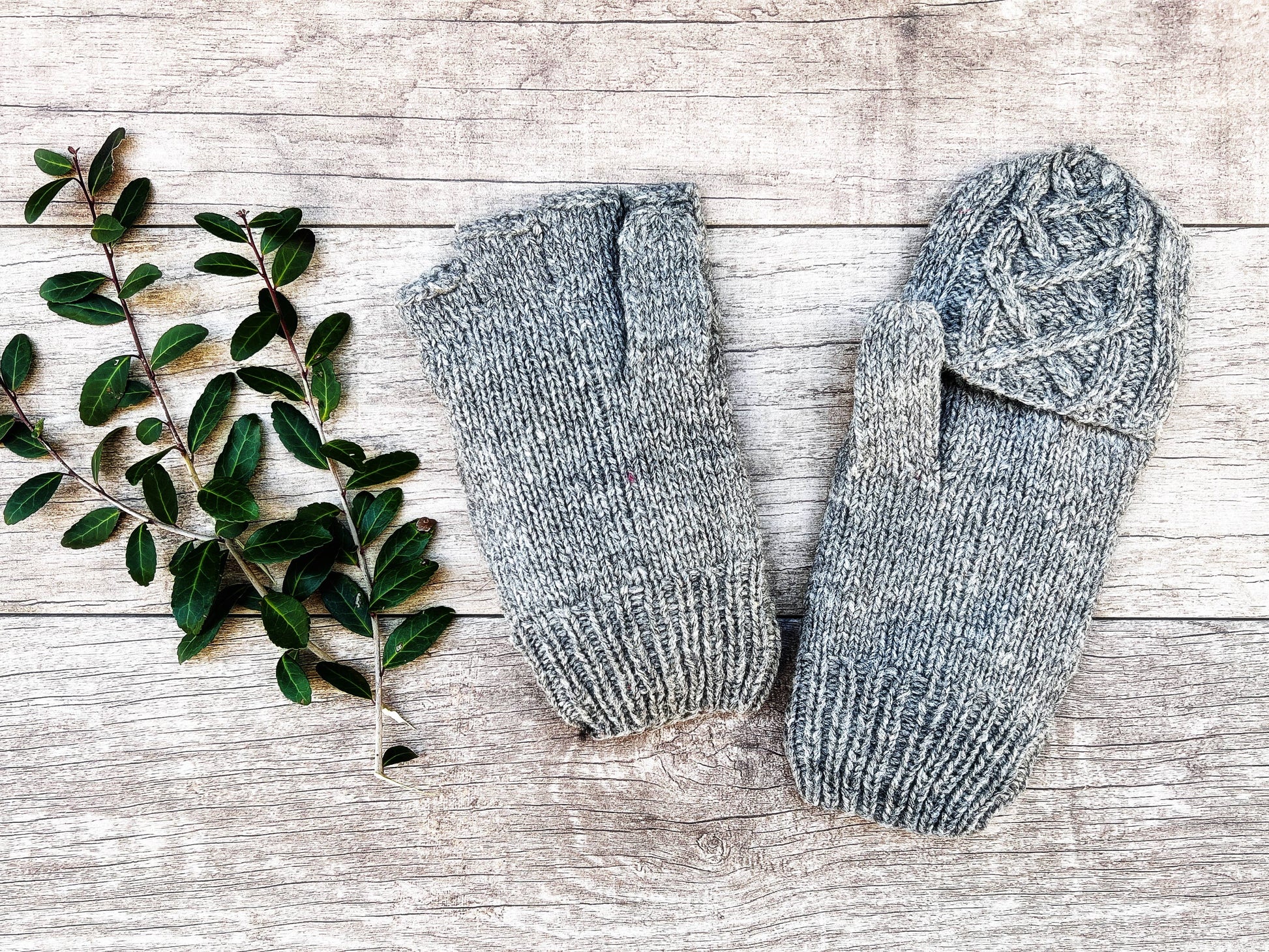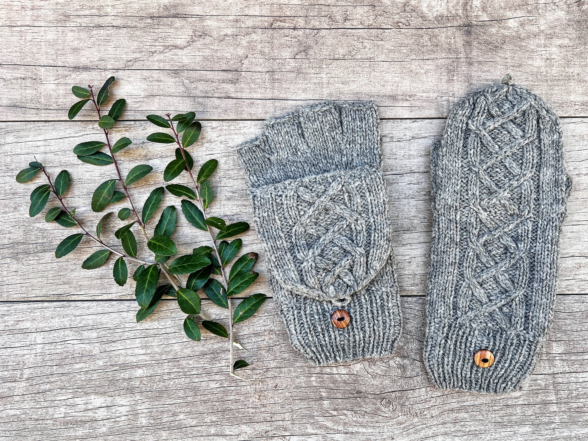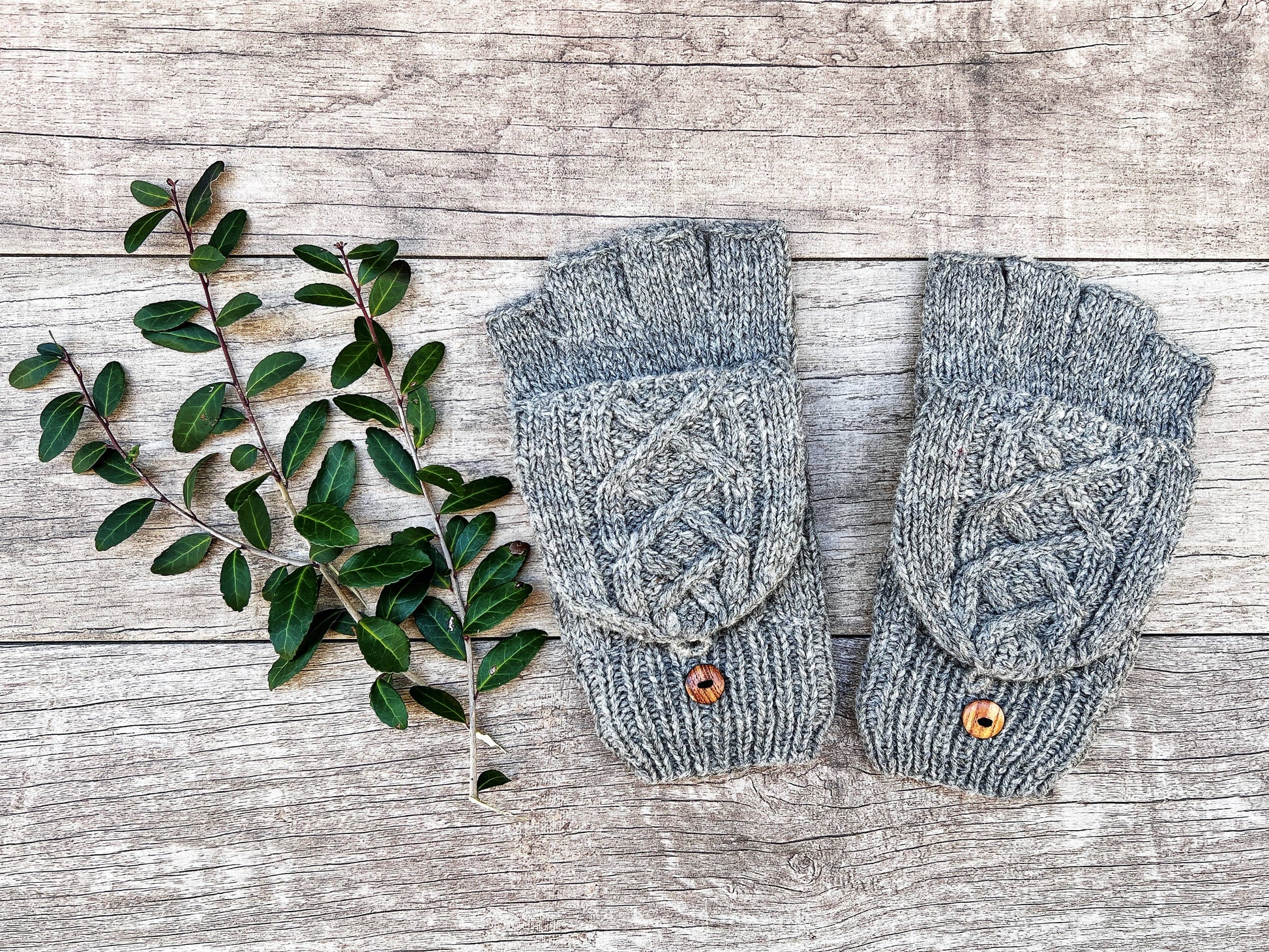 Classic Handmade Knitted Irish Cable Patterned Fingerless Convertible Gloves Mittens. Hand knitted style created from sustainable Alpaca Wool sourced in the Andes. Each Flip-Top Mitten is an entirely handmade work of art. The rich Alpaca Woolen colors are either natural tones or hand dyed and dried in the sun. The Glittens are 100% Alpaca with Micro Fleece Lining around the Palm for Softness and Extra Warmth. (Note that the Flip top and fingers are not lined.)