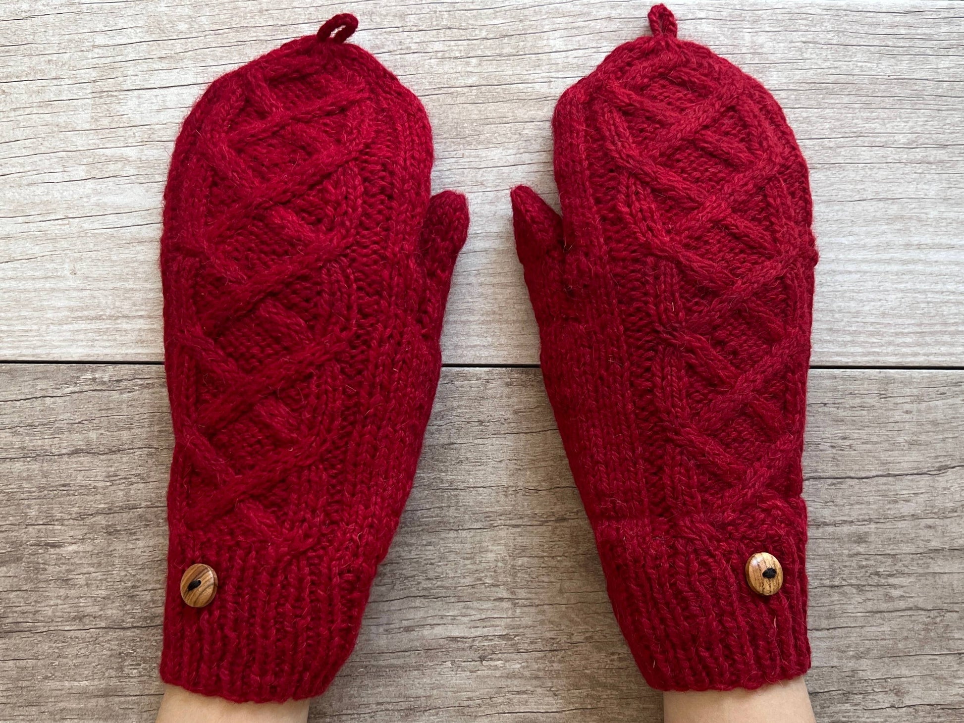 Classic Handmade Knitted Irish Cable Patterned Fingerless Convertible Gloves Mittens. Hand knitted style created from sustainable Alpaca Wool sourced in the Andes. Each Flip-Top Mitten is an entirely handmade work of art. The rich Alpaca Woolen colors are either natural tones or hand dyed and dried in the sun. The Glittens are 100% Alpaca with Micro Fleece Lining around the Palm for Softness and Extra Warmth. (Note that the Flip top and fingers are not lined.)