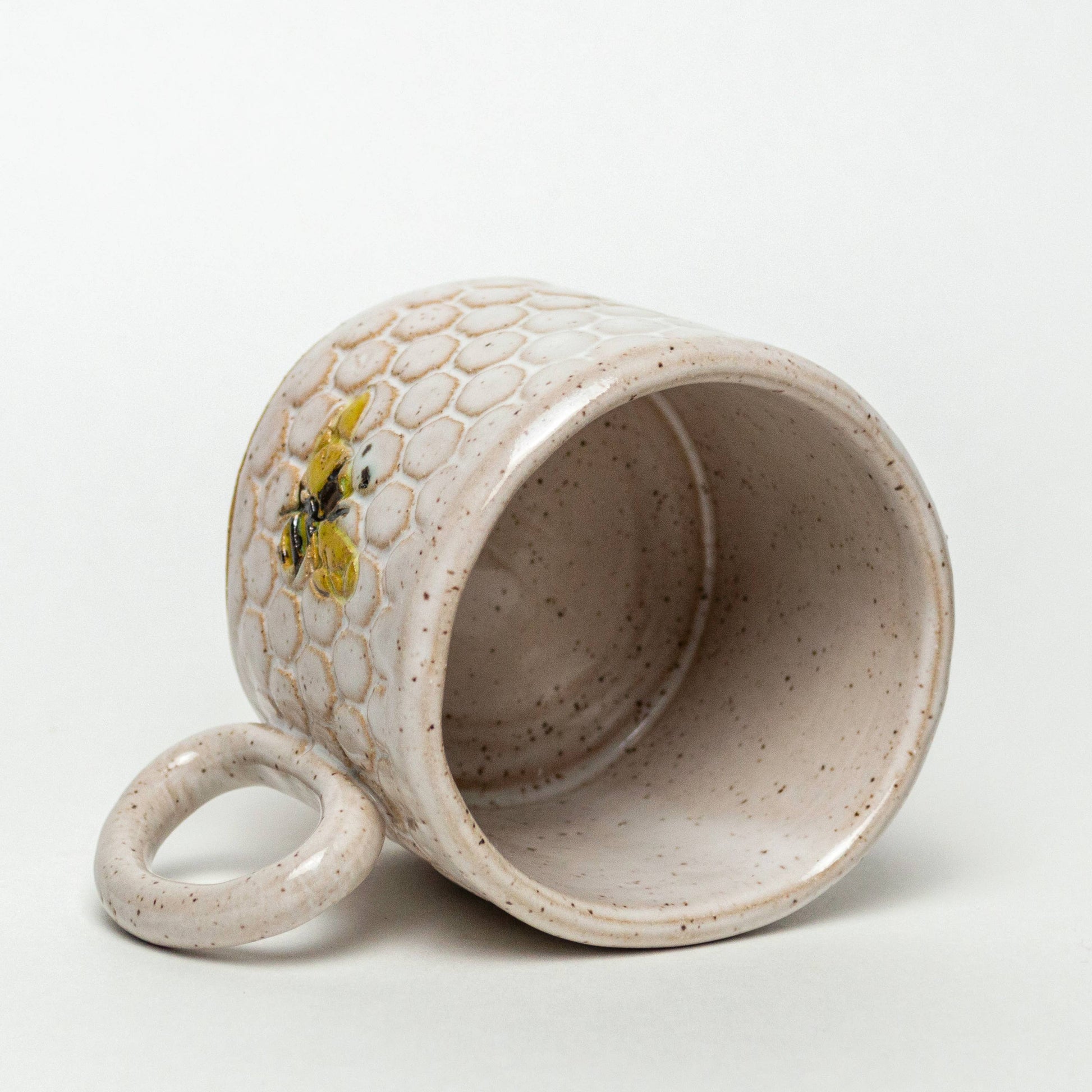 This sweet 8 oz. stoneware mug features a charming bee pattern and is hand-built and hand-glazed with care in Oberlin, Ohio. Measuring approximately 4 inches long by 3 1/4 inches wide and 2 3/4 inches high, it’s perfect for a small cup of coffee, tea, or even a little honey-sweetened treat. Food, dishwasher, and microwave safe for everyday use.