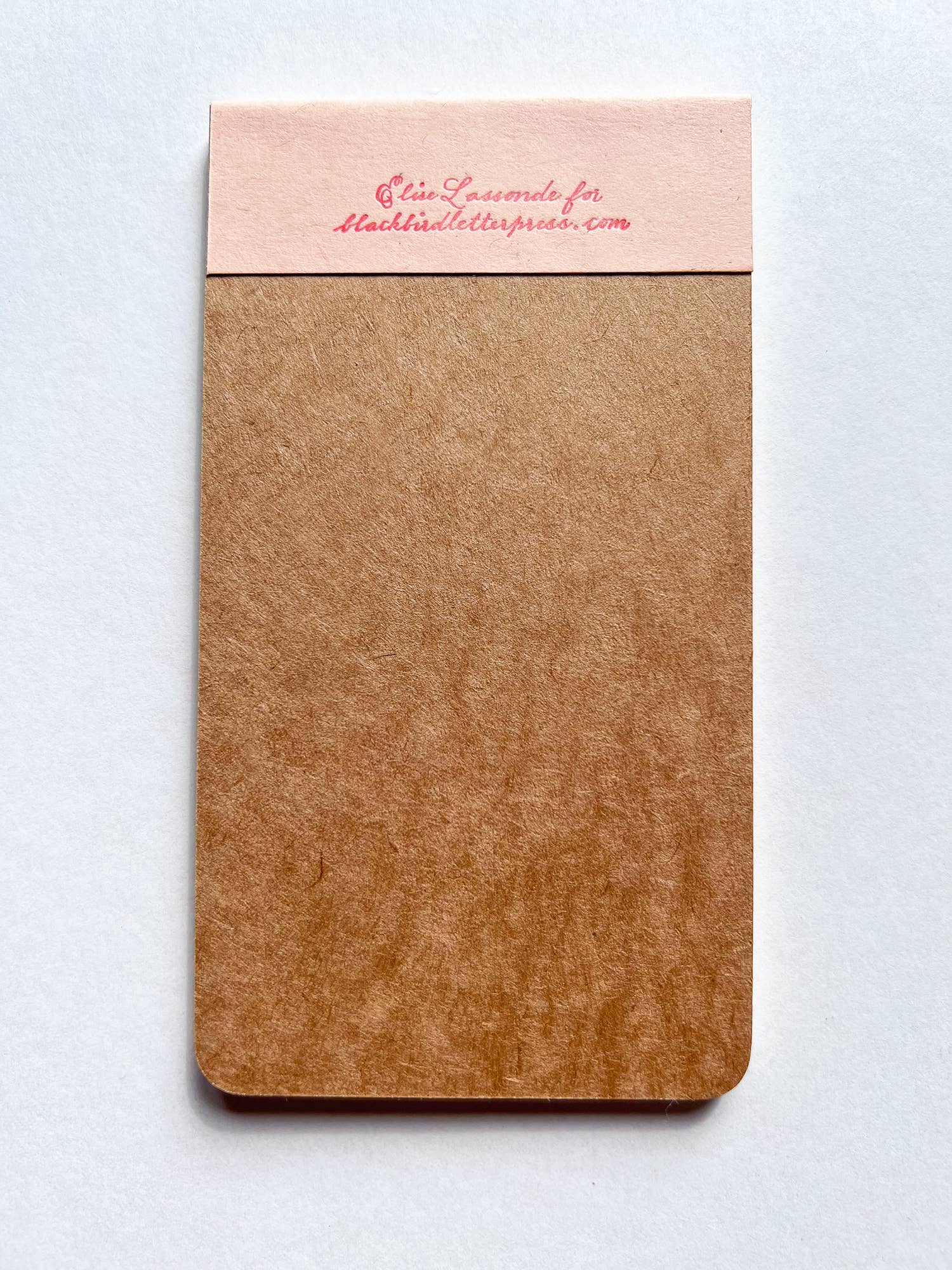 Small size jotter.  Cover is letterpress printed in burnt orange ink with original linocut illustration on 100# mustard paper. 30 blank 100% recycled sheets. Interior text block is perfect bound at the top, then glued and finished in our studio. Measures 3”x5.5”” with two rounded corners.