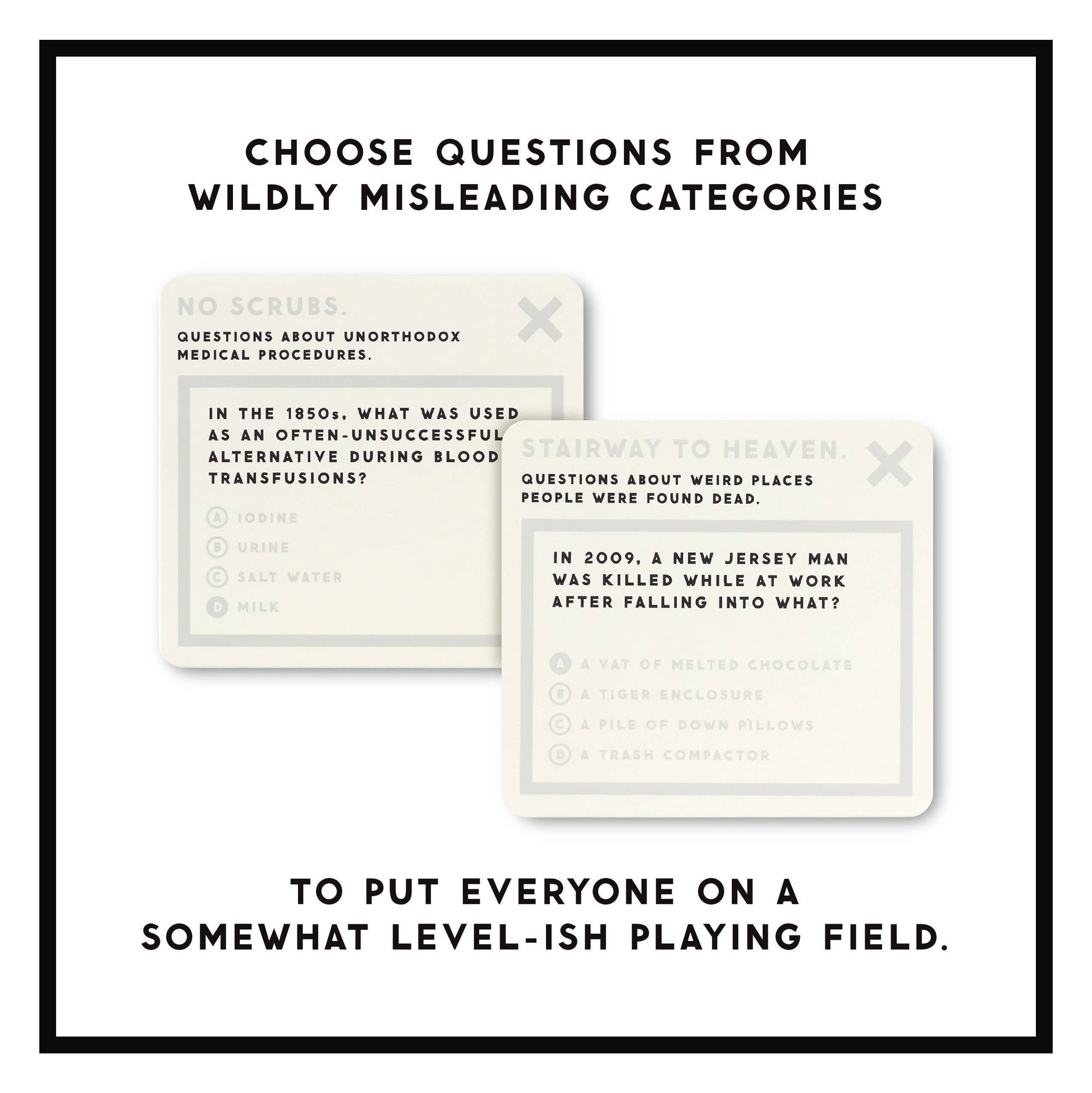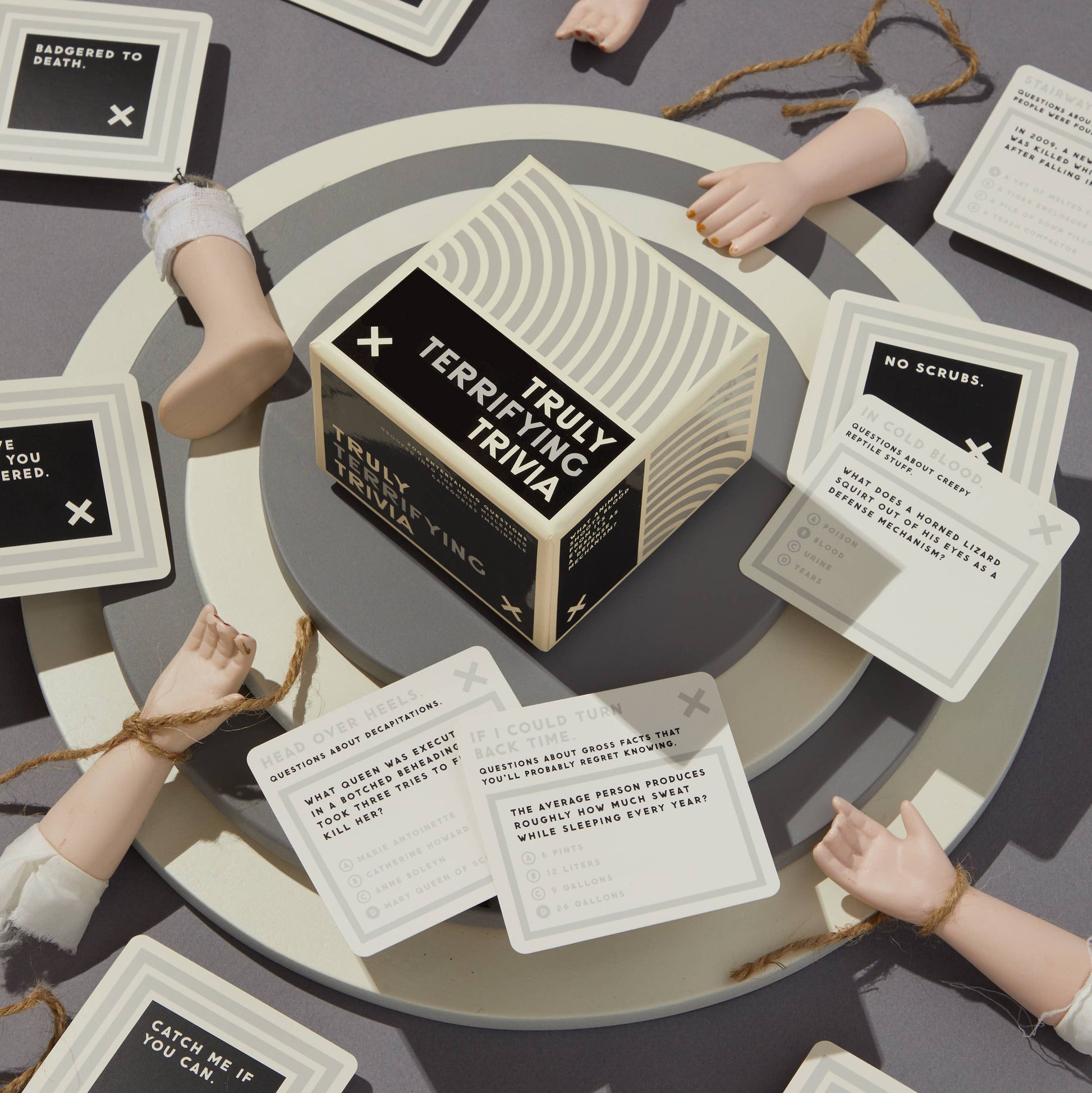Trivia should be fun–not feel like a homework assignment. That's why this Truly Terrifying Trivia set by Brass Monkey is filled with some of the most random true crime & generally creepy knowledge we could find…and even better, you'll choose your questions from a bunch of misleading categories. For example: 'Suicide Squad.' Those are questions about Dr. Kevorkian, by the way. • Includes 200 unique trivia cards specifically themed around truly terrifying facts (that you'll probably regret learning). • Each question is grouped in an entertainingly-misleading category to keep everyone guessing–literally. • Comes with an instruction sheet that explains 3 different ways to play (depending on how smart you think you are). • Each of our trivia collections contains entirely different questions (and categories). Collect them all to build the world's most useless trivia library. • Suitable for 2-8+ people. Go crazy. • The outer box measures 3.5" square by 3" (89mm x 89mm x 76mm).