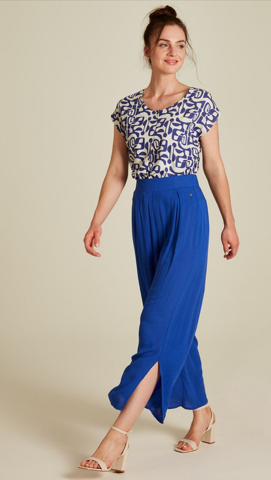 A breezy and light Eco-Vero pant, with the option to tie the bottoms. Why? Think walking on the beach, or a breezy summer day. The perfect solution for your summer vacay, in a beautiful deep and bright blue. Made responsibly in India.