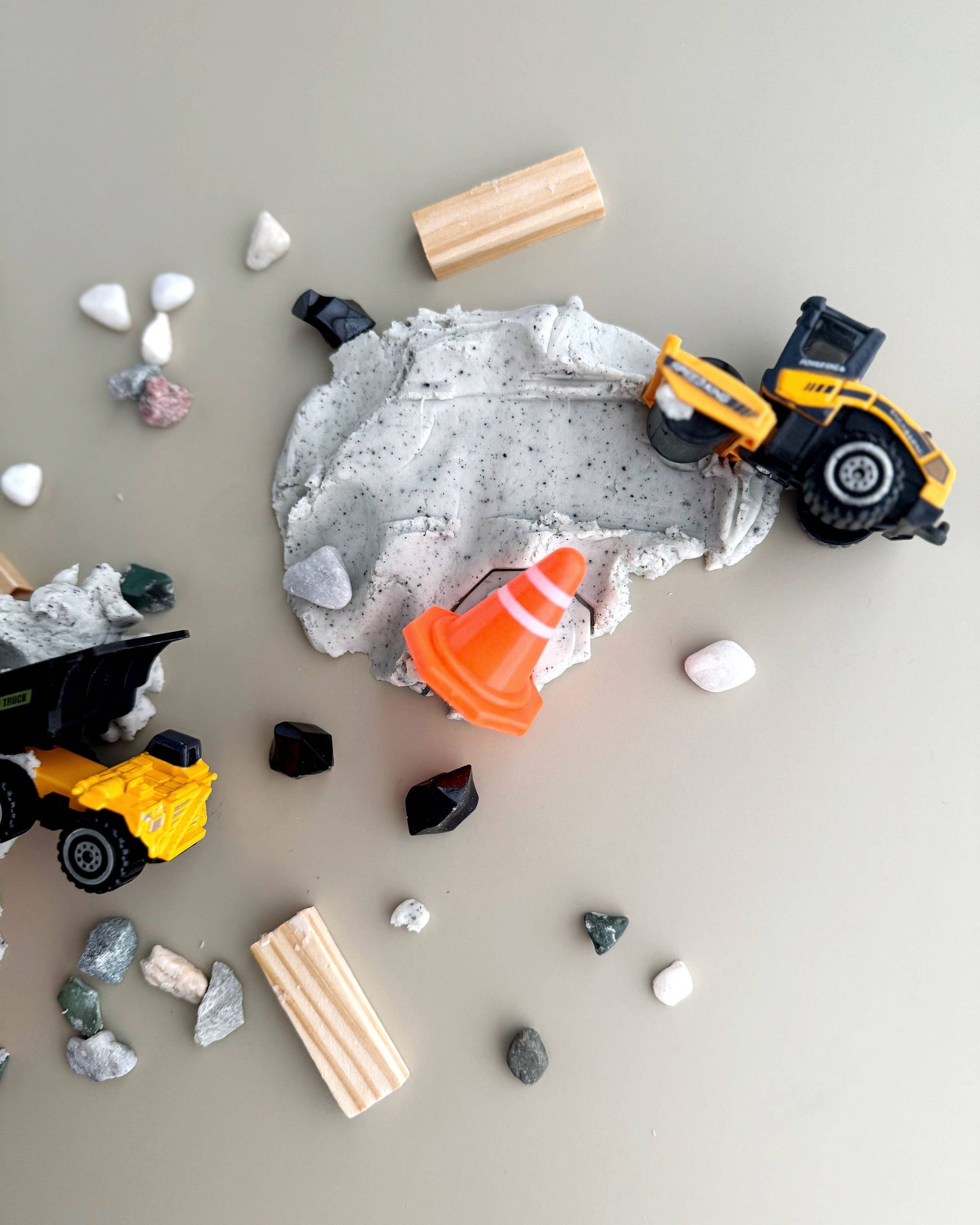 Includes: 8 oz Gravel Grey (Cookies & Cream) KidDough, Construction Vehicle, Construction Cone, Road Signs, Mini Lumber Pieces, Black Acrylic Rocks and Natural Stones. This Play Kit is recommended for Ages 3+ Scent: Cookies & Cream. Ingredients: Wheat Flour, Salt, Canola Oil, Cream of Tartar, Water, Food Coloring, Organic Potassium Sorbate, and Fragrance.