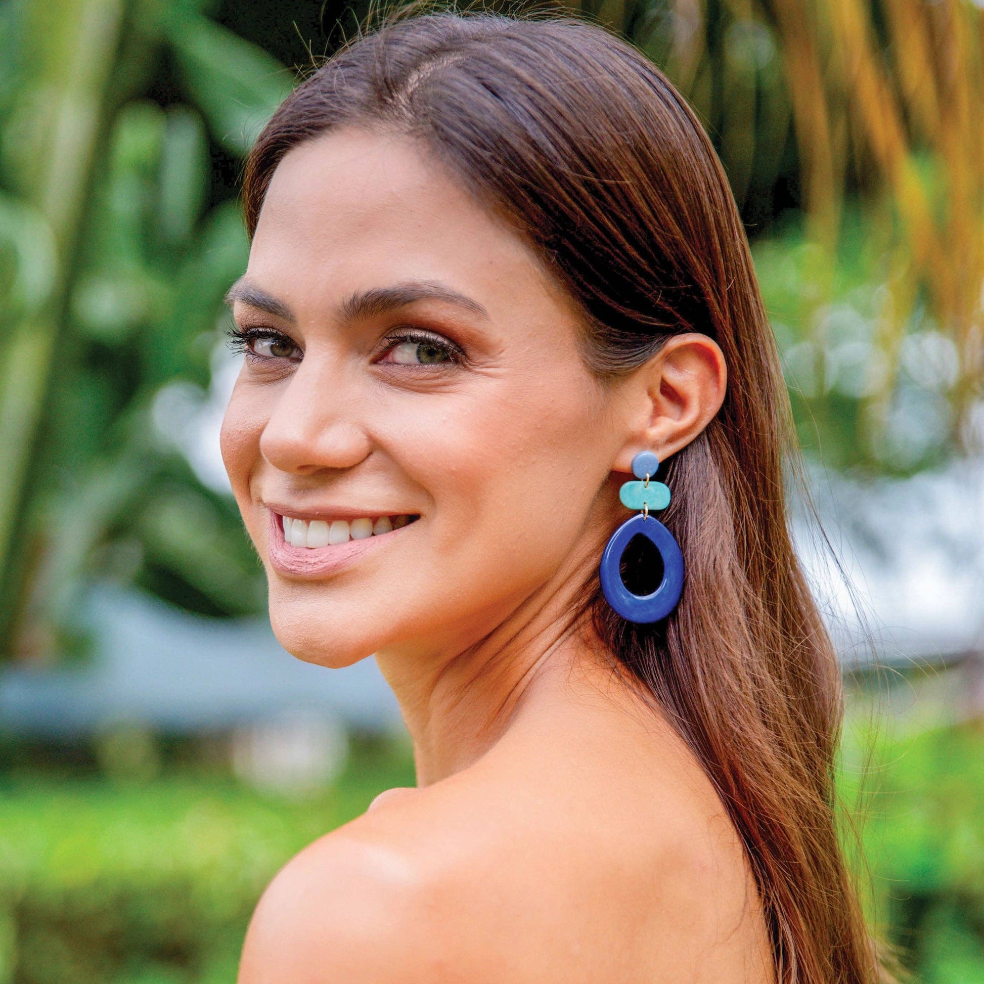 Show off your style in these radiant and bold statement earrings. Handmade with smooth and shiny tagua pieces on a post design. Approximately 2.5" L. Materials: Sustainable Tagua nut. Ear wires are hypoallergenic, nickel free, and lead free. Organic Vegetable Dyes. Handmade in Ecuador. Due to the nature and size of the tagua nuts, all sizes are approximate…not exact. Colors may vary from the pictures slightly due to the nature of the Tagua Nut.