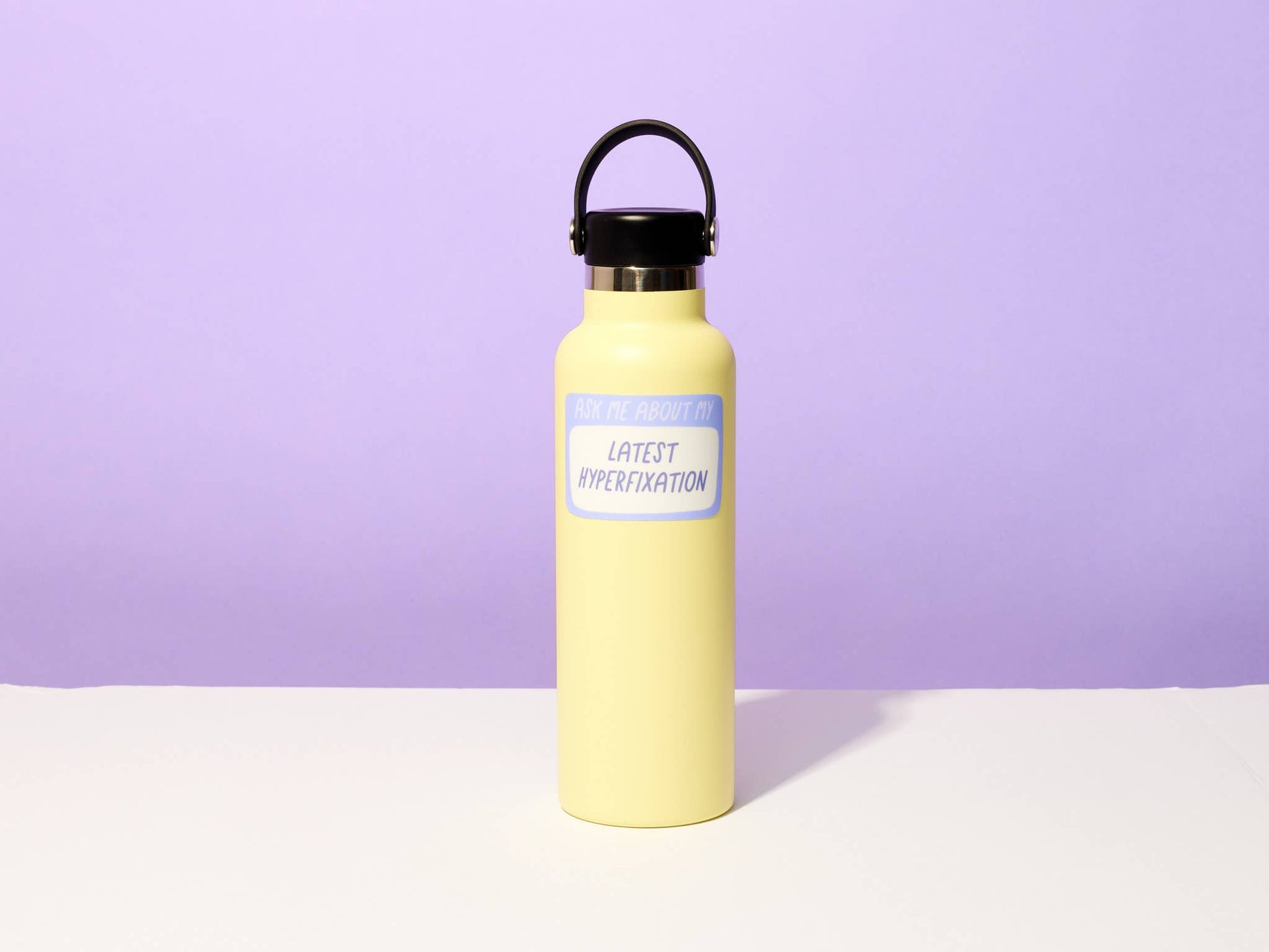 A sticker for those of us who cant get enough of a thing... until we can't stand the thought of it. Sticker reads, "ask me about my latest hyperfixation". Die cut, vinyl sticker. Approximately 3". Durable, waterproof, appropriate for outdoor use and dishwasher safe. Made in the US. Artwork by Kiwi Schloffel - Your Gal Kiwi for And Here We Are.