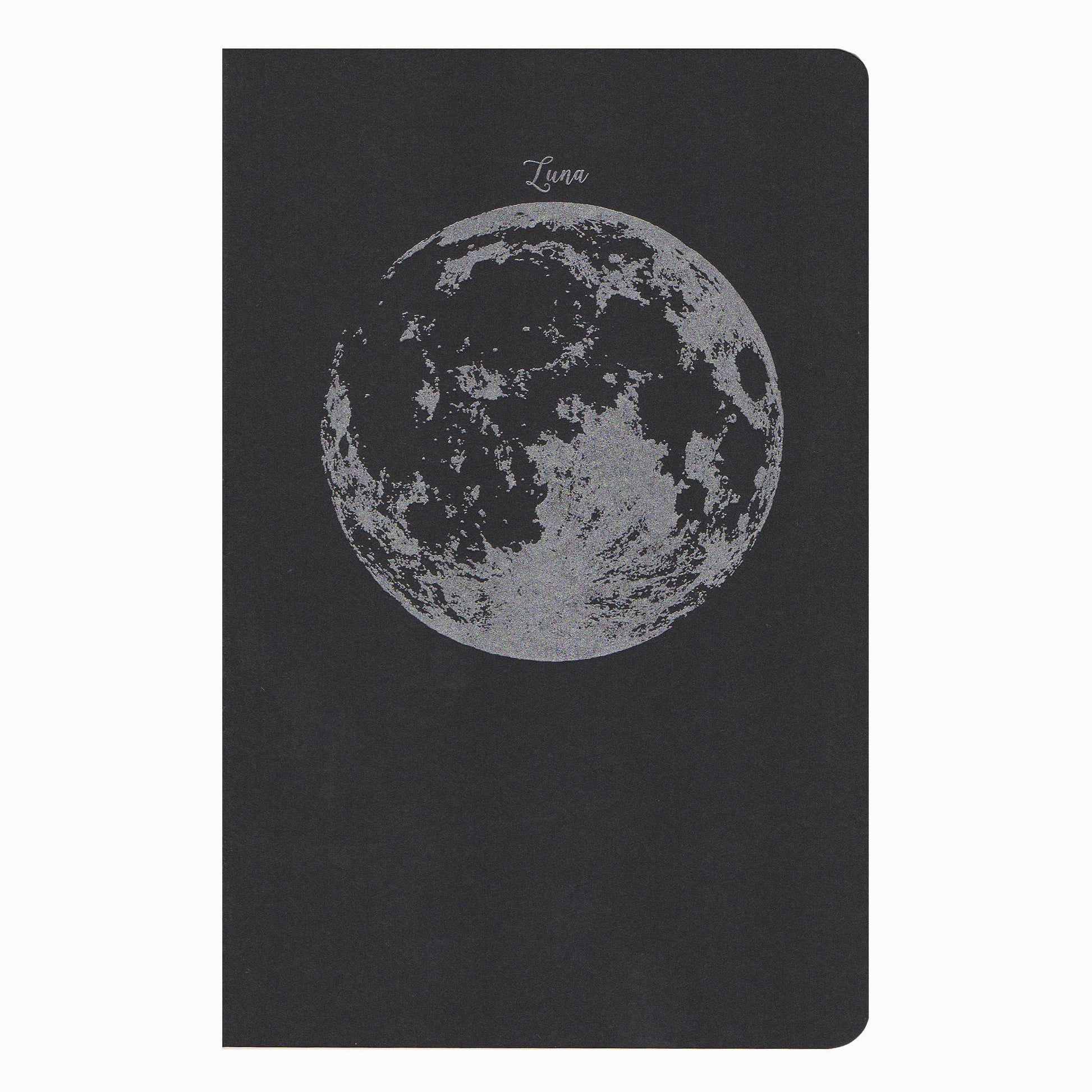 Luna : Moon • Large size notebook • cover is letterpress printed in silver ink with original illustration on 100# black paper • 72 blank 100% recycled pages • measures 4.5”x7” with two rounded corners