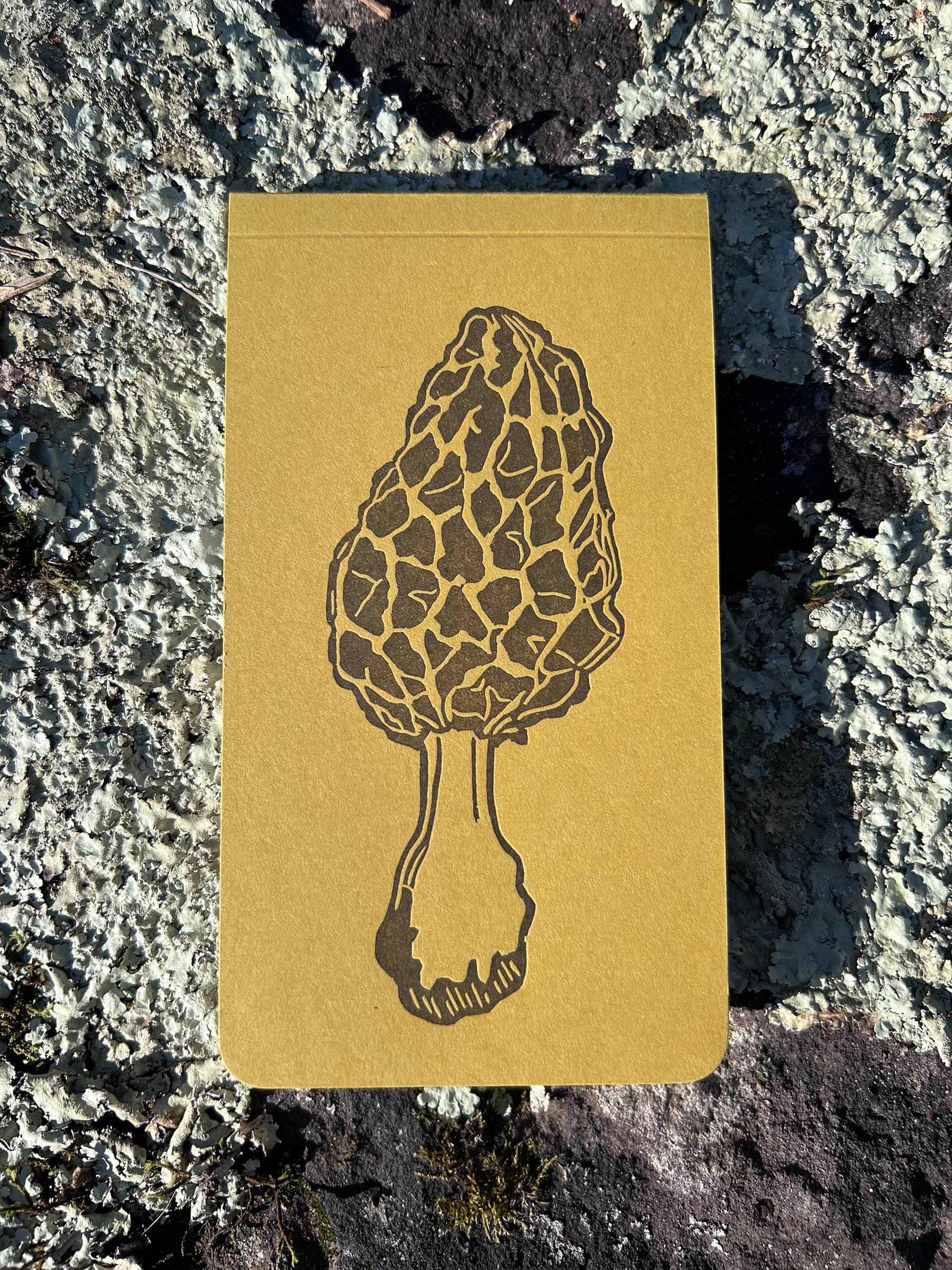 Small size jotter.  Cover is letterpress printed in burnt orange ink with original linocut illustration on 100# mustard paper. 30 blank 100% recycled sheets. Interior text block is perfect bound at the top, then glued and finished in our studio. Measures 3”x5.5”” with two rounded corners.