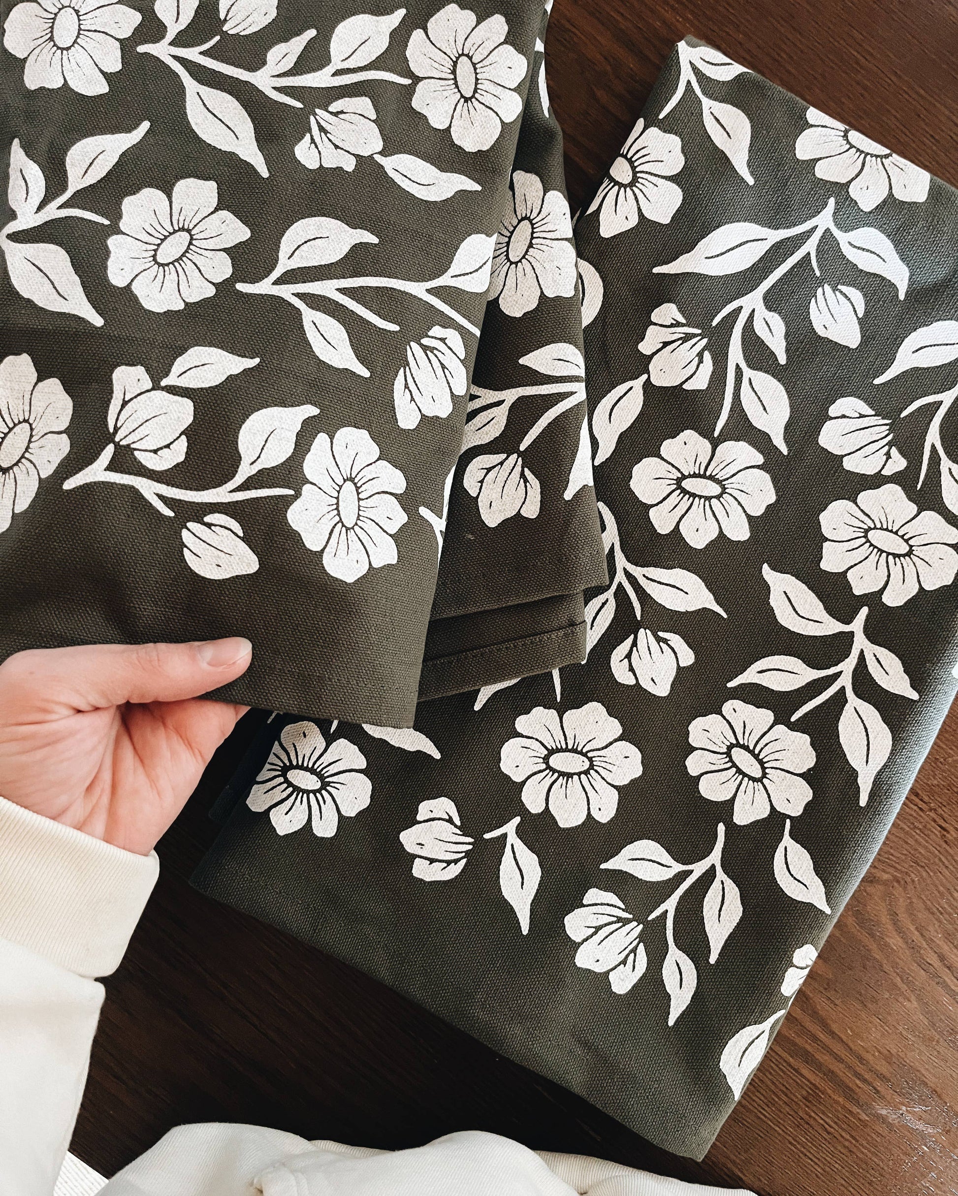 Bring beauty to the kitchen with an artist designed tea towel. Designed to match our bestselling signature floral glass mug, this towel brings some simple beauty without overwhelming your kitchen space. These tea towels are screen-printed in India with an original Flora West Design illustration. It features white florals on a deep olive background. 100% heavy organic cotton.