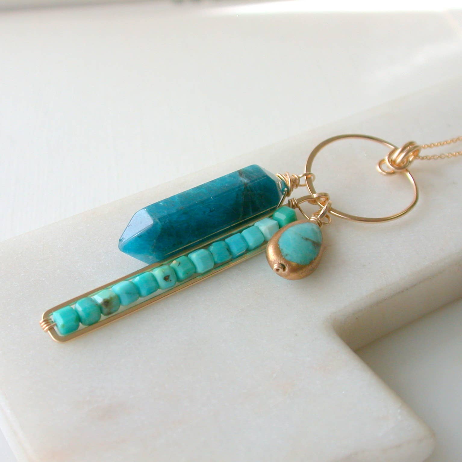 A collection of brass-rimmed turquoise teardrops, a row of turquoise cubes and a large apatite pendant all hanging from a handcrafted hoop. The pendant measures 3". Shown in 14k gold fill. Lobster clasp. One inch extension chain.