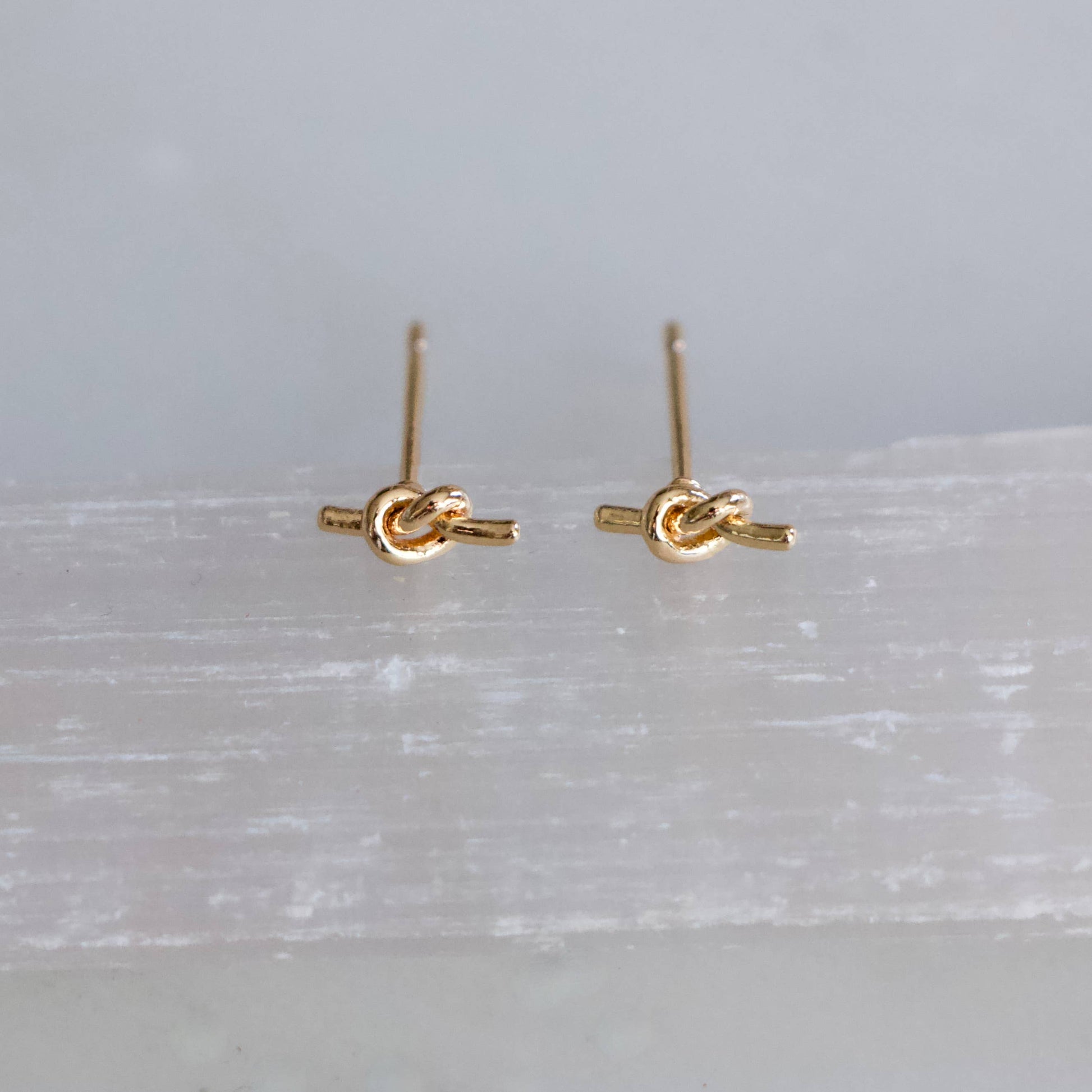 Delicate knot studs that won't weigh you down—perfect for all-day wear. Crafted from 18K gold-plated brass and completely lead and nickel-free, these petite beauties measure just 3x7mm. Sweet, simple, and oh-so-charming.
