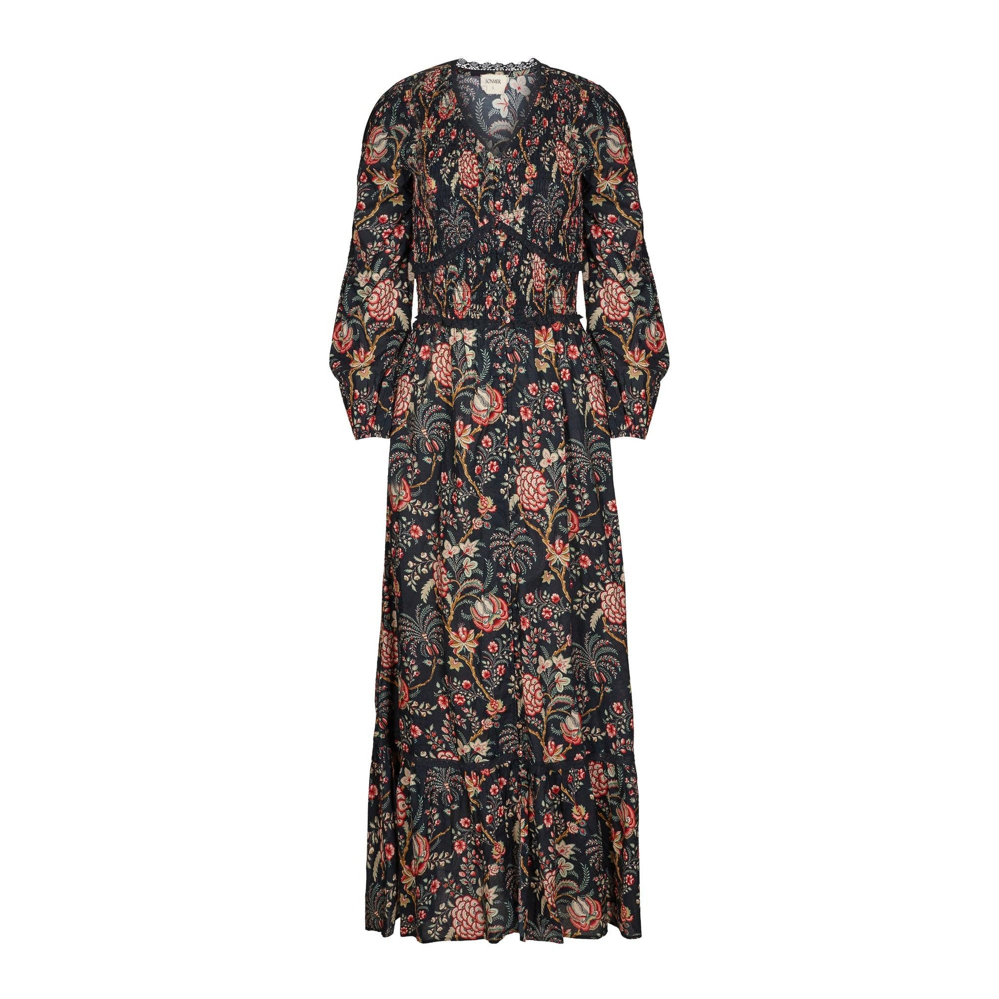 Inspired by vibrant Indian florals, the Valery dress brings effortless charm and breathability to your wardrobe. Crafted from soft organic cotton, this enchanting piece showcases a flattering V-neckline paired with a fitted smocked bodice adorned with delicate crochet trim. The silhouette flows into a voluminous skirt crowned with a playful ruffle hem for that perfect twirl-worthy moment. Every detail whispers femininity while keeping you cool and comfortable. Responsibly made in India with REACH and BSCI certifications. Pure cotton bliss.
